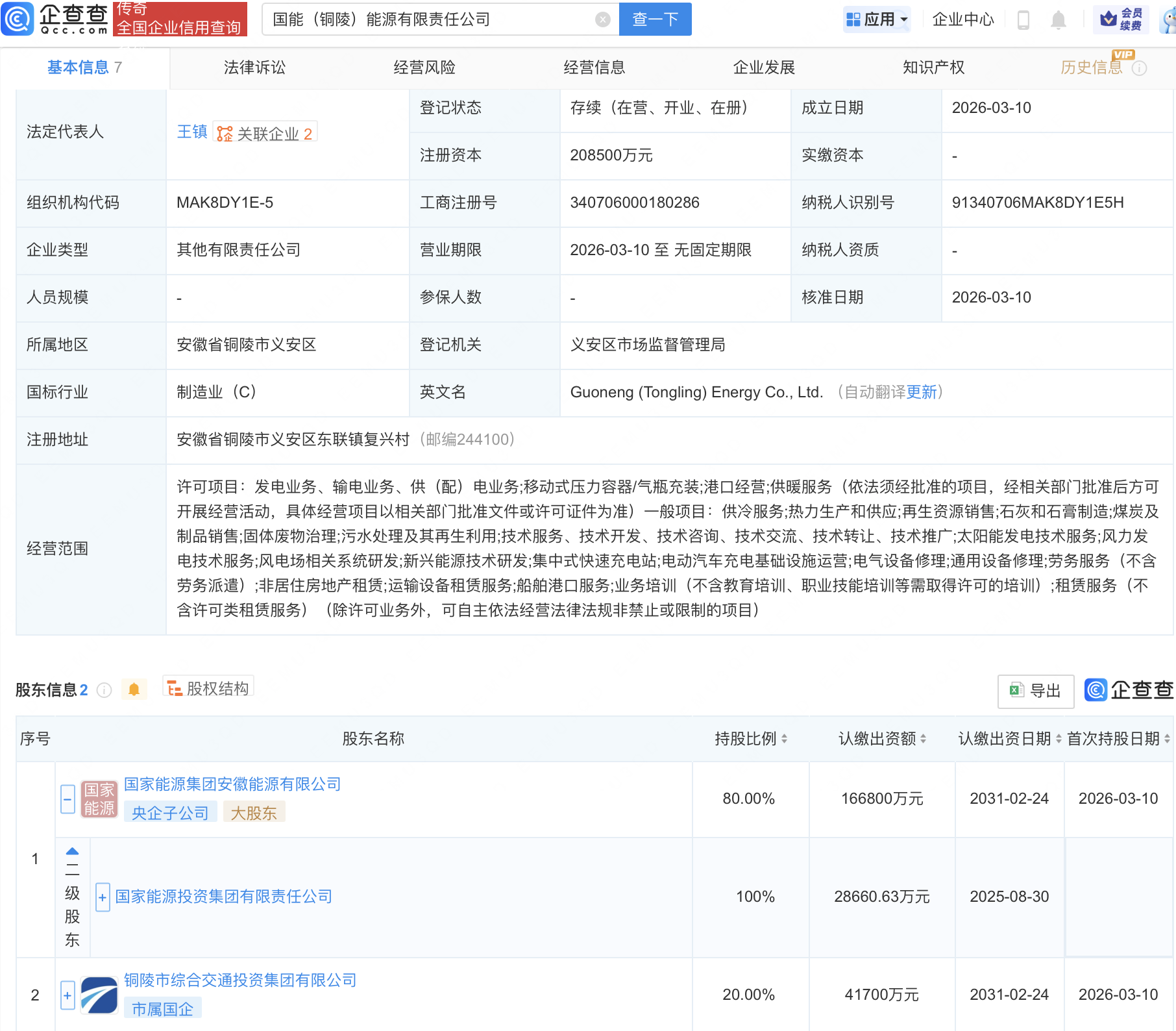 企查查APP显示,近日,国能(铜陵)能源有限责任公司成立,注册资本20.85亿元,经营范围包含:太阳能发电技术服务;风力发电技术服务;风电场相关系统研发;新兴能源技术研发等。企查查股权穿透显示,该公司由国家能源投资集团有限责任公司全资子公司国家能源集团安徽能源有限公司等共同持股。