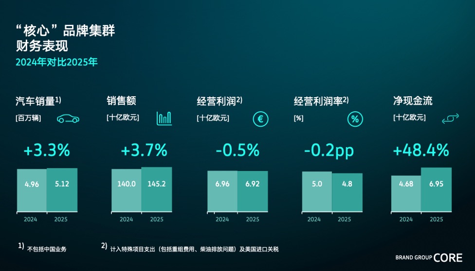 大众汽车“核心”品牌集群在2025年展现出强劲韧性,尽管面临多重市场挑战,仍通过战略调整与效率提升实现稳健增长。全年汽车销量达512万辆,同比增长3.3%,销售额攀升至1452亿欧元,增幅3.7%。经营利润受重组成本、柴油排放事件及美国关税等特殊因素影响,微降至68亿欧元,但剔除这些因素后可达82亿欧元,与既定目标高度契合。