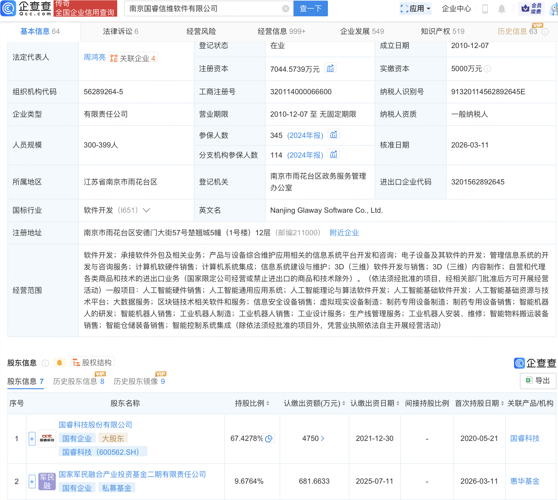 企查查APP显示,近日,南京国睿信维软件有限公司发生工商变更,新增国家军民融合产业投资基金二期有限责任公司、中国国有企业结构调整基金二期股份有限公司、工业母机产业投资基金(有限合伙)等为股东,同时注册资本增至7044.57万元。企查查信息显示,该公司成立于2010年,经营范围包含:人工智能基础软件开发;人工智能基础资源与技术平台;大数据服务;区块链技术相关软件和服务等,由国睿科技(600562)持股67.43%。据其官网,该公司是一家自主工业软件及智造解决方案提供商。