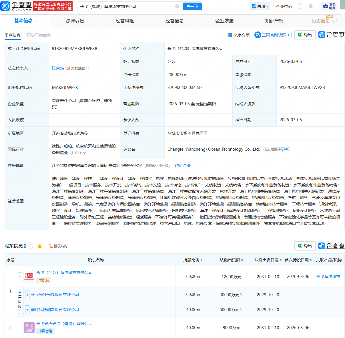 企查查APP显示,近日,长飞(盐城)海洋科技有限公司成立,法定代表人为陈慧雄,注册资本为2亿元,经营范围包含:光缆制造;光缆销售;水下系统和作业装备制造;海洋工程装备制造;海洋工程装备销售等。企查查股权穿透显示,该公司由长飞光纤(601869)旗下长飞(江苏)海洋科技有限公司及长飞光纤光缆(香港)有限公司共同持股。