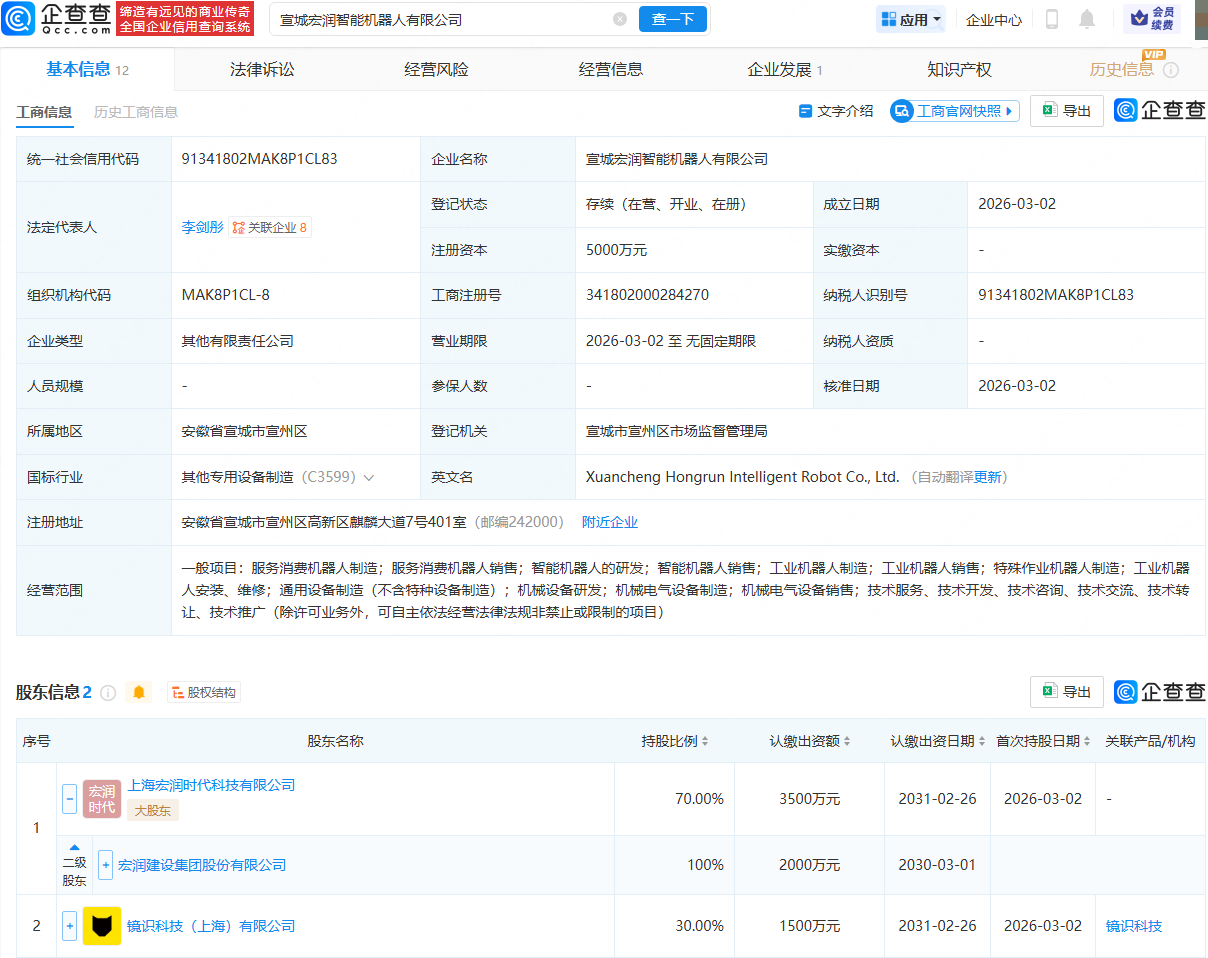 企查查APP显示,近日,宣城宏润智能机器人有限公司成立,法定代表人为李剑彤,注册资本为5000万元,经营范围包含:服务消费机器人制造;服务消费机器人销售;智能机器人的研发;智能机器人销售;工业机器人制造等。企查查股权穿透显示,该公司由宏润建设(002062)全资子公司上海宏润时代科技有限公司、镜识科技(上海)有限公司共同持股。