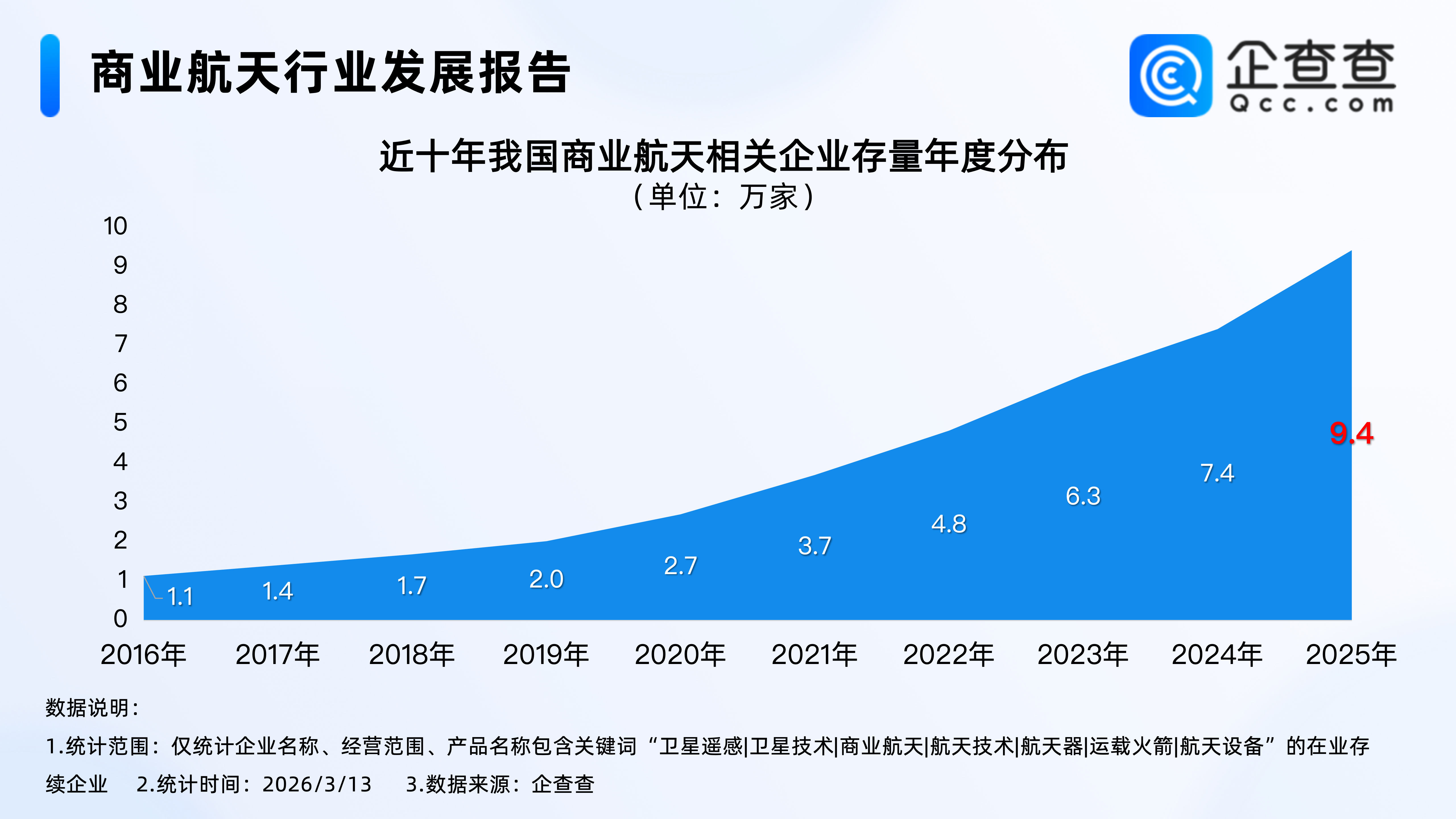 企查查数据显示,近十年,我国商业航天相关企业存量逐年增加,从2021年开始,每年存量增加过万家,2025年年底,我国商业行业相关企业存量相比2024年年底增加超2万。截至2026年3月13日,我国现存9.7万家商业航天相关企业。