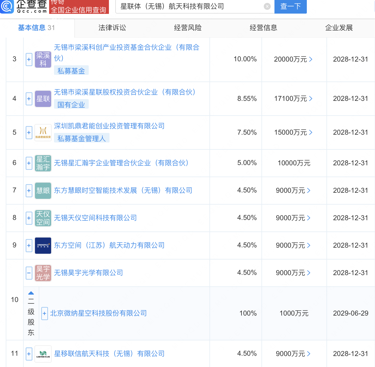 企查查APP显示,近日,星联体(无锡)航天科技有限公司成立,注册资本20亿元,经营范围包含:人工智能应用软件开发;人工智能行业应用系统集成服务;卫星通信服务;卫星导航服务;卫星导航多模增强应用服务系统集成等。企查查股权穿透显示,该公司由北京微纳星空科技股份有限公司全资子公司无锡昊宇光学有限公司等共同持股。