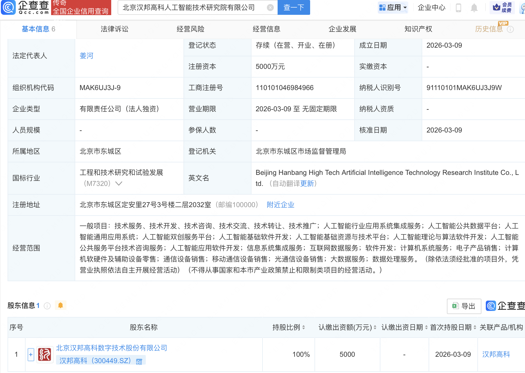 企查查APP显示,近日,北京汉邦高科人工智能技术研究院有限公司成立,经营范围包含:人工智能双创服务平台;人工智能基础软件开发;人工智能基础资源与技术平台;人工智能理论与算法软件开发等。企查查股权穿透显示,该公司由汉邦高科(300449)全资持股。