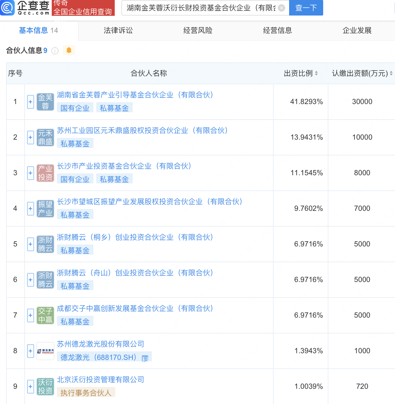 企查查APP显示,近日,湖南金芙蓉沃衍长财投资基金合伙企业(有限合伙)成立,经营范围包含:创业投资(限投资未上市企业);以私募基金从事股权投资、投资管理、资产管理等活动。企查查股权穿透显示,该企业由湖南省金芙蓉产业引导基金合伙企业(有限合伙)、德龙激光(688170)等共同出资。