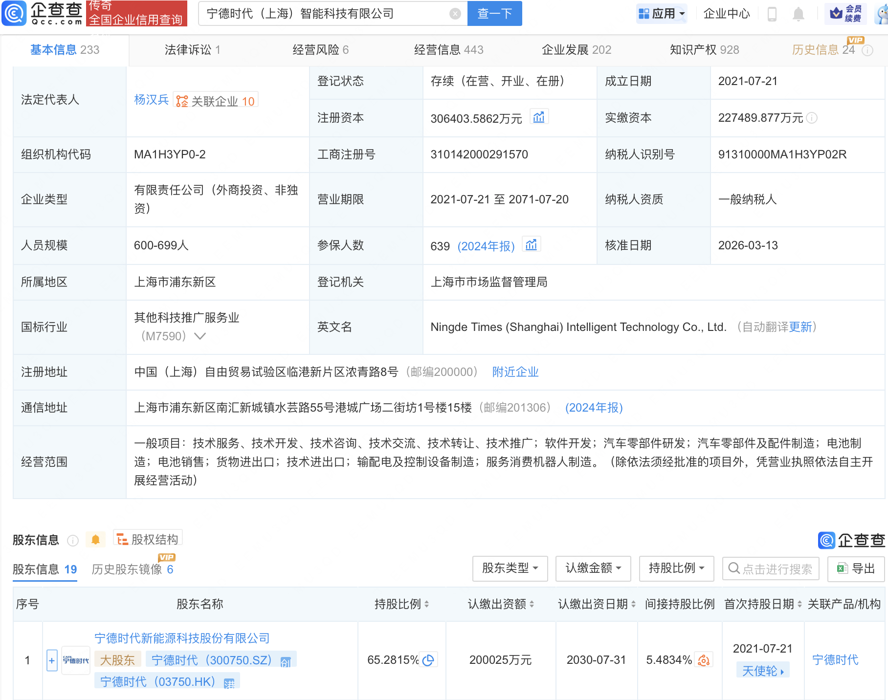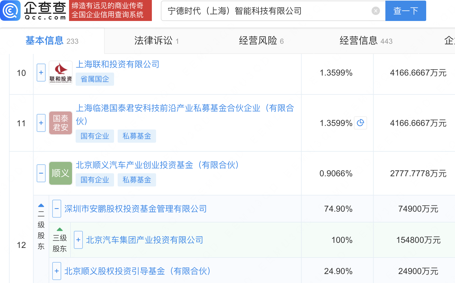 企查查APP显示,近日,宁德时代(上海)智能科技有限公司发生工商变更,新增北京汽车集团产业投资有限公司旗下北京顺义汽车产业创业投资基金(有限合伙)等为股东,同时注册资本增至30.6亿元。企查查信息显示,该公司成立于2021年,经营范围包含:汽车零部件研发;汽车零部件及配件制造;电池制造;电池销售等。公开信息显示,时代智能是宁德时代旗下专注一体化智能底盘产品研发和技术服务子公司,核心产品为磐石底盘。