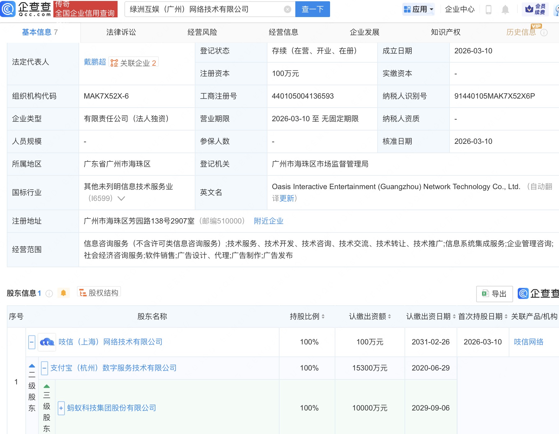 企查查APP显示,近日,绿洲互娱(广州)网络技术有限公司成立,法定代表人为戴鹏超,经营范围包括信息咨询服务、信息系统集成服务、企业管理咨询、社会经济咨询服务等。企查查股权穿透显示,该公司由蚂蚁科技集团股份有限公司间接全资持股。