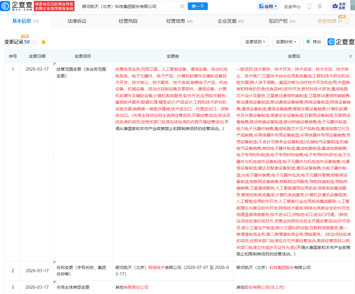 企查查APP显示,近日,银河航天(北京)科技集团股份有限公司发生工商变更,企业名称由“银河航天(北京)网络技术有限公司”变更为“银河航天(北京)科技集团股份有限公司”;市场主体类型由其他有限责任公司变更为其他股份有限公司(非上市);同时,公司经营范围变更为“卫星移动通信终端制造;卫星移动通信终端销售;移动通信设备制造;移动通信设备销售;网络设备制造等”。