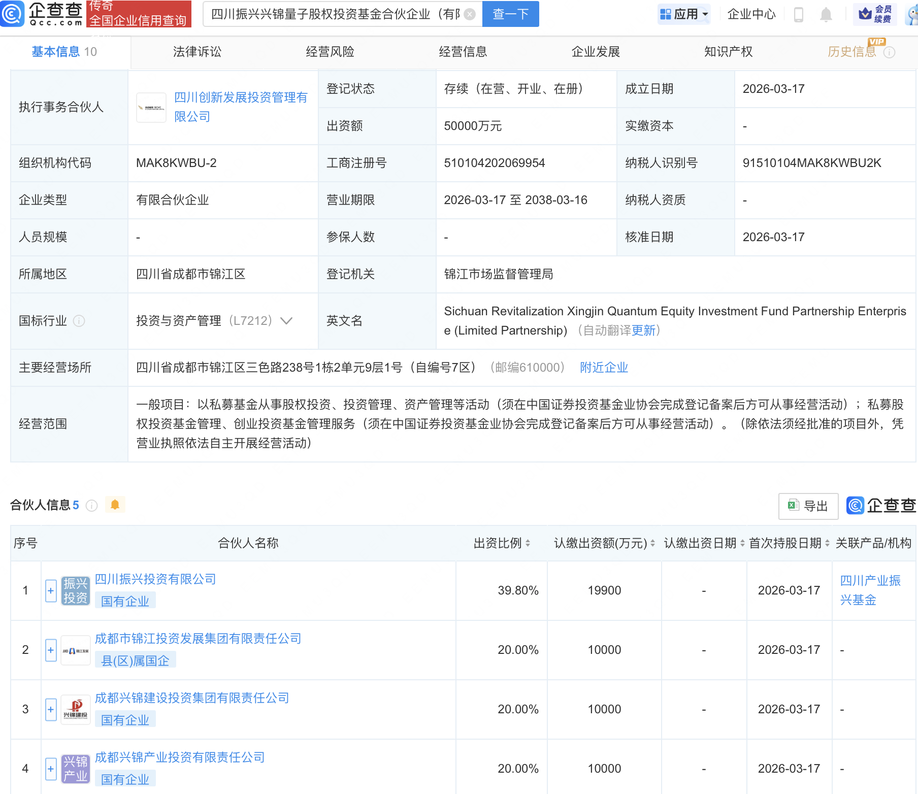 企查查APP显示,近日,四川振兴兴锦量子股权投资基金合伙企业(有限合伙)成立,出资额5亿元,经营范围包含:以私募基金从事股权投资、投资管理、资产管理等活动。企查查股权穿透显示,该企业由四川振兴投资有限公司、成都市锦江投资发展集团有限责任公司等共同出资。