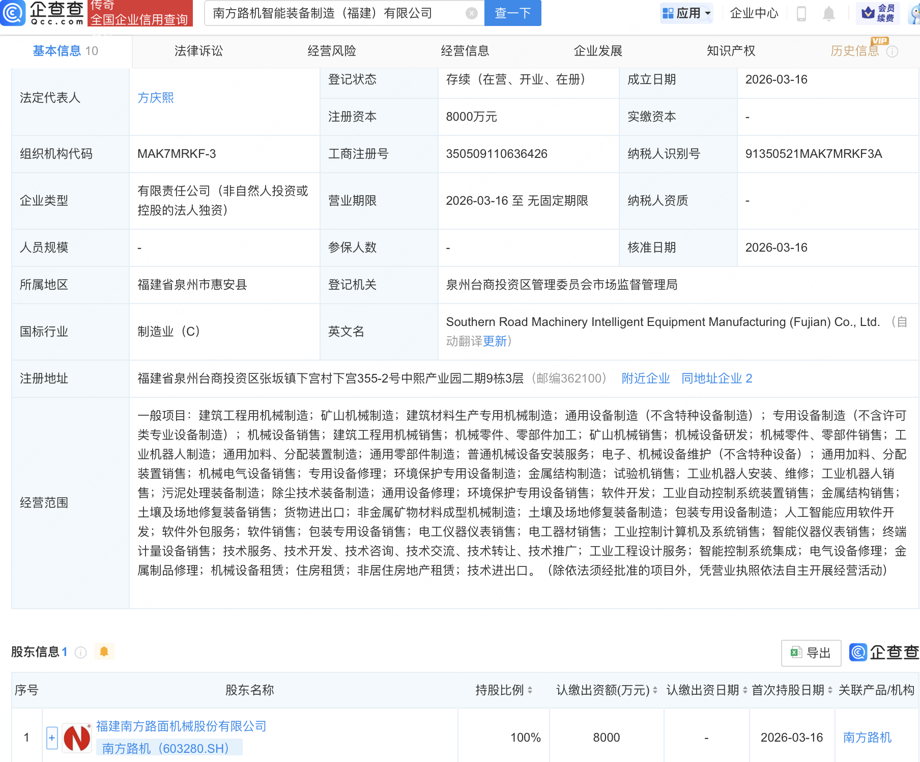 企查查APP显示,近日,南方路机智能装备制造(福建)有限公司成立,注册资本8000万元,经营范围包含:人工智能应用软件开发;软件外包服务;软件销售;包装专用设备销售;电工仪器仪表销售等。企查查股权穿透显示,该公司由南方路机(603280)全资持股。