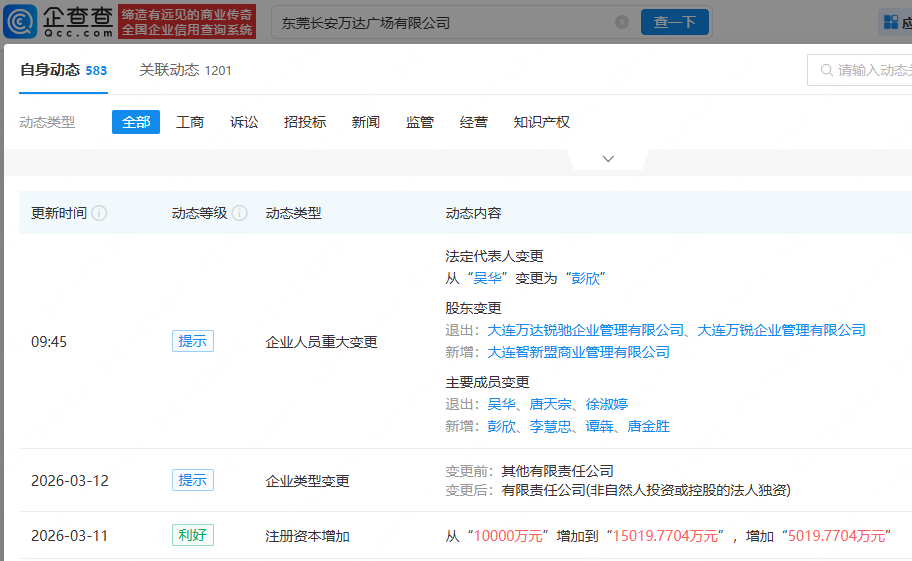 企查查APP显示,近日,东莞长安万达广场有限公司发生工商变更,注册资本增加至1.5亿元,原股东大连万达锐驰企业管理有限公司、大连万锐企业管理有限公司退出,新增大连智新盟商业管理有限公司为唯一股东,同时,公司的主要人员亦发生变更。