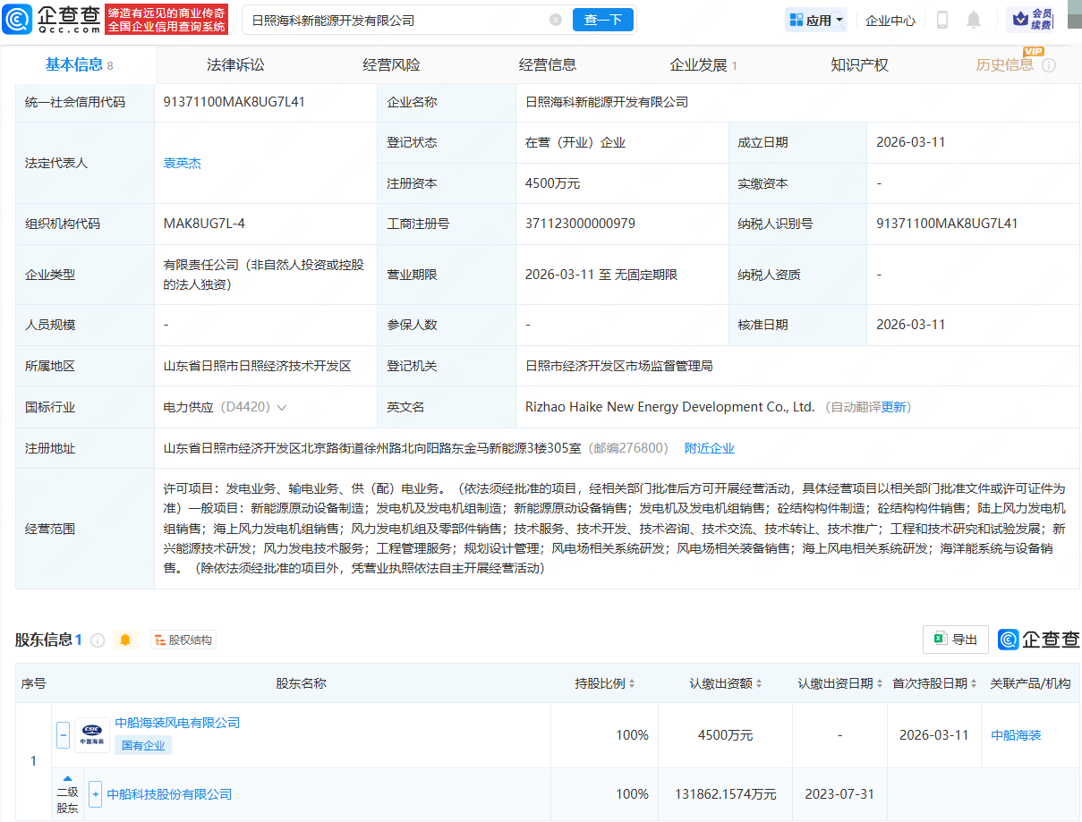 企查查APP显示,近日,日照海科新能源开发有限公司成立,法定代表人为袁英杰,注册资本为4500万元,经营范围包含:新能源原动设备制造;发电机及发电机组制造;陆上风力发电机组销售;海上风力发电机组销售等。企查查股权穿透显示,该公司由中船科技(600072)间接全资持股。
