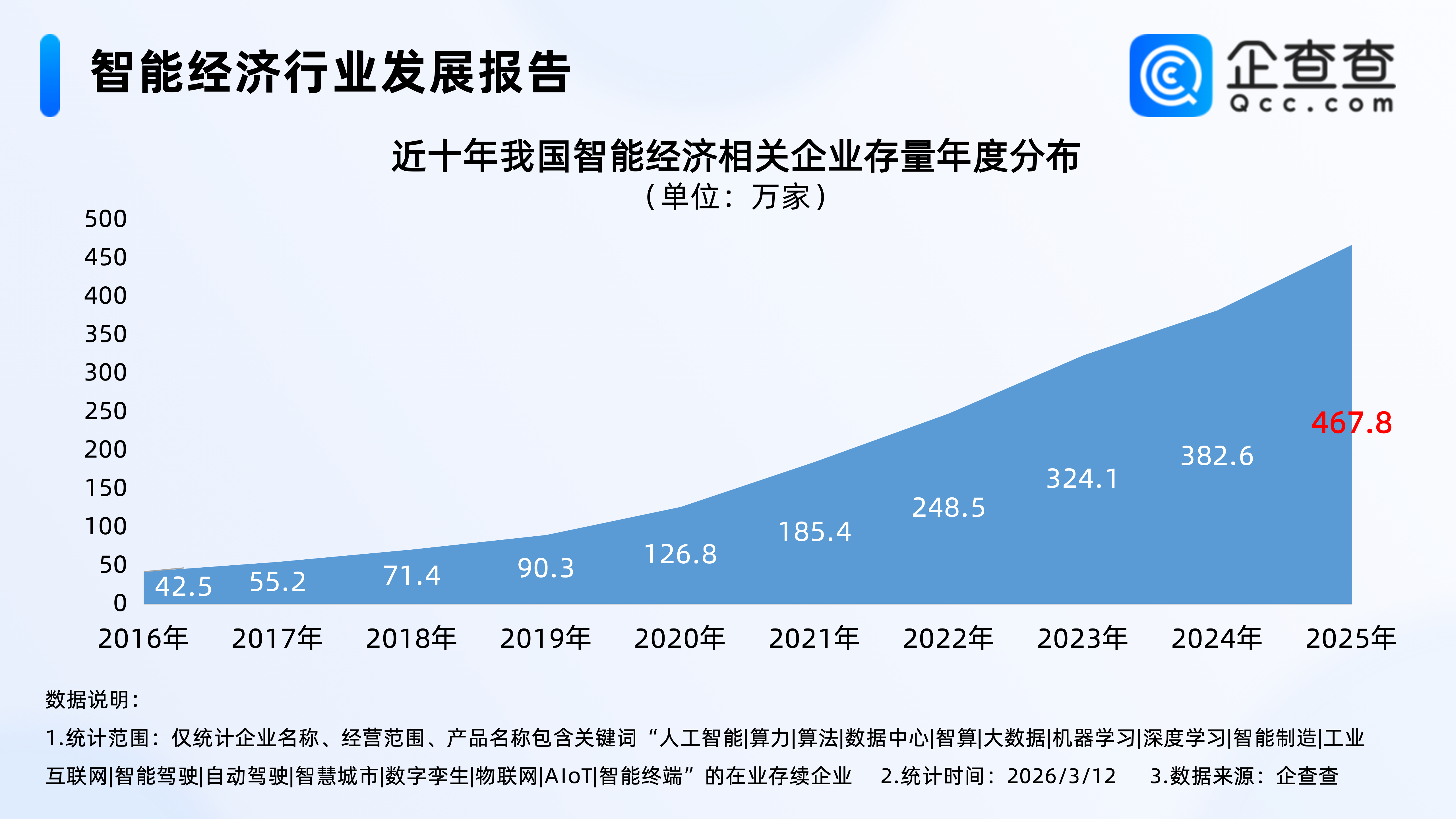 企查查数据显示,近十年,我国智能经济相关企业存量逐年增加,并分别于2020年、2022年、2023年突破100万家、200万家、300万家;2025年我国智能经济相关企业存量已突破400万家。截至2026年3月12日,我国现存480.5万家智能经济相关企业。