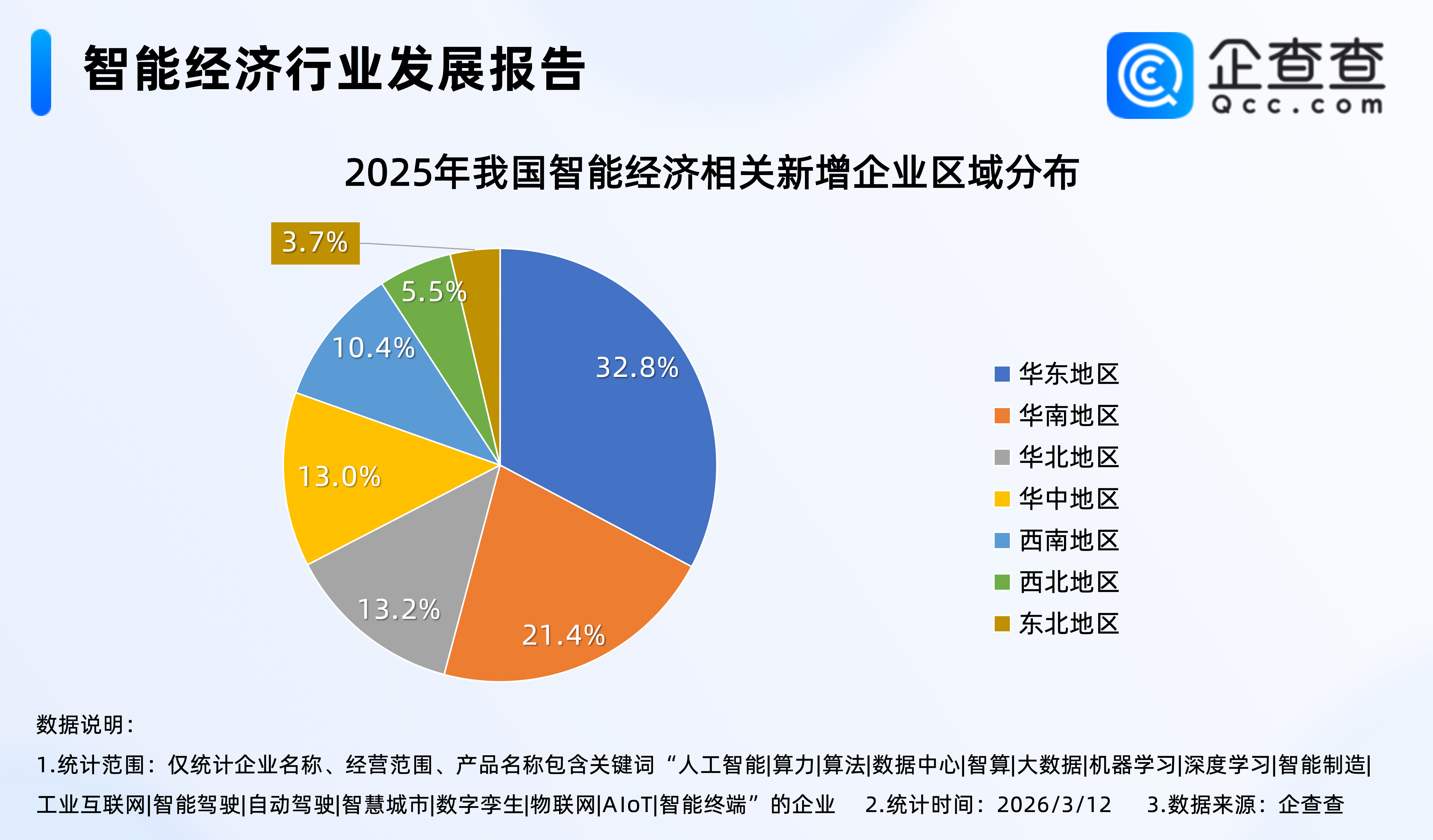 企查查数据显示,2025年新注册的近127万家智能经济相关企业中,分布在华东地区的相关企业最多,占比32.8%,其次是华南地区,占比21.4%,西北、东北地区相对较少,分占5.5%、3.7%。