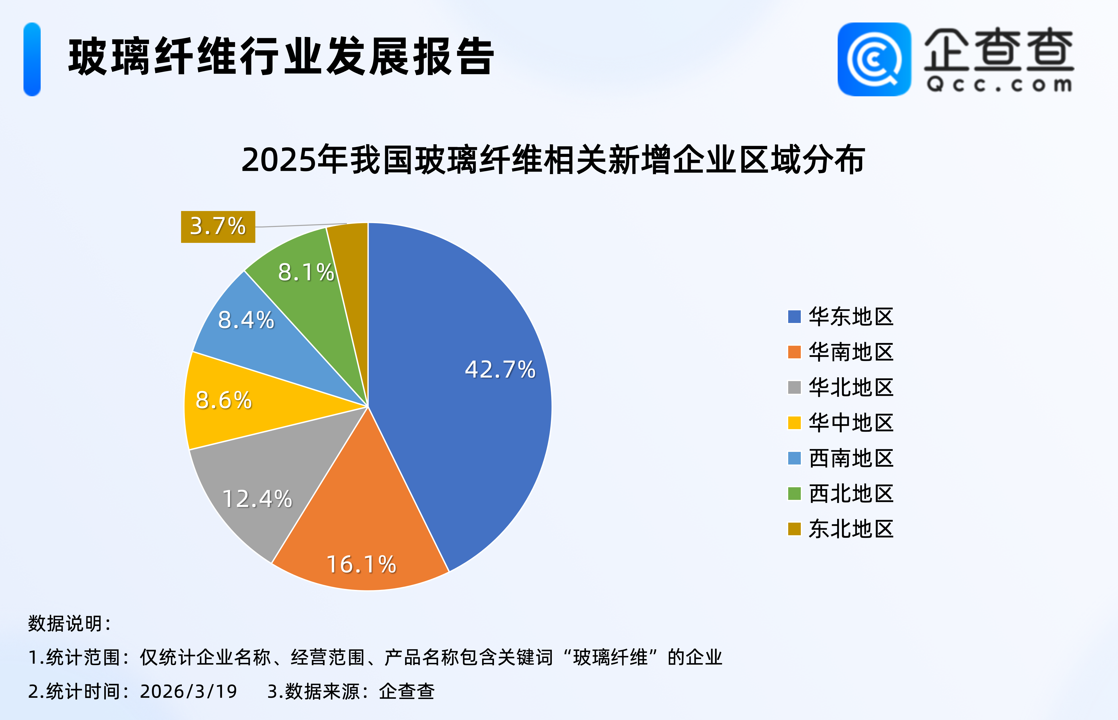 企查查数据显示,2025年注册的15.64万家玻璃纤维相关企业中,分布在华东地区的相关企业最多,占比超四成,达42.7%,其次是华南地区,占比16.1%,西北、东北地区相对较少,分别占比8.1%、3.7%。