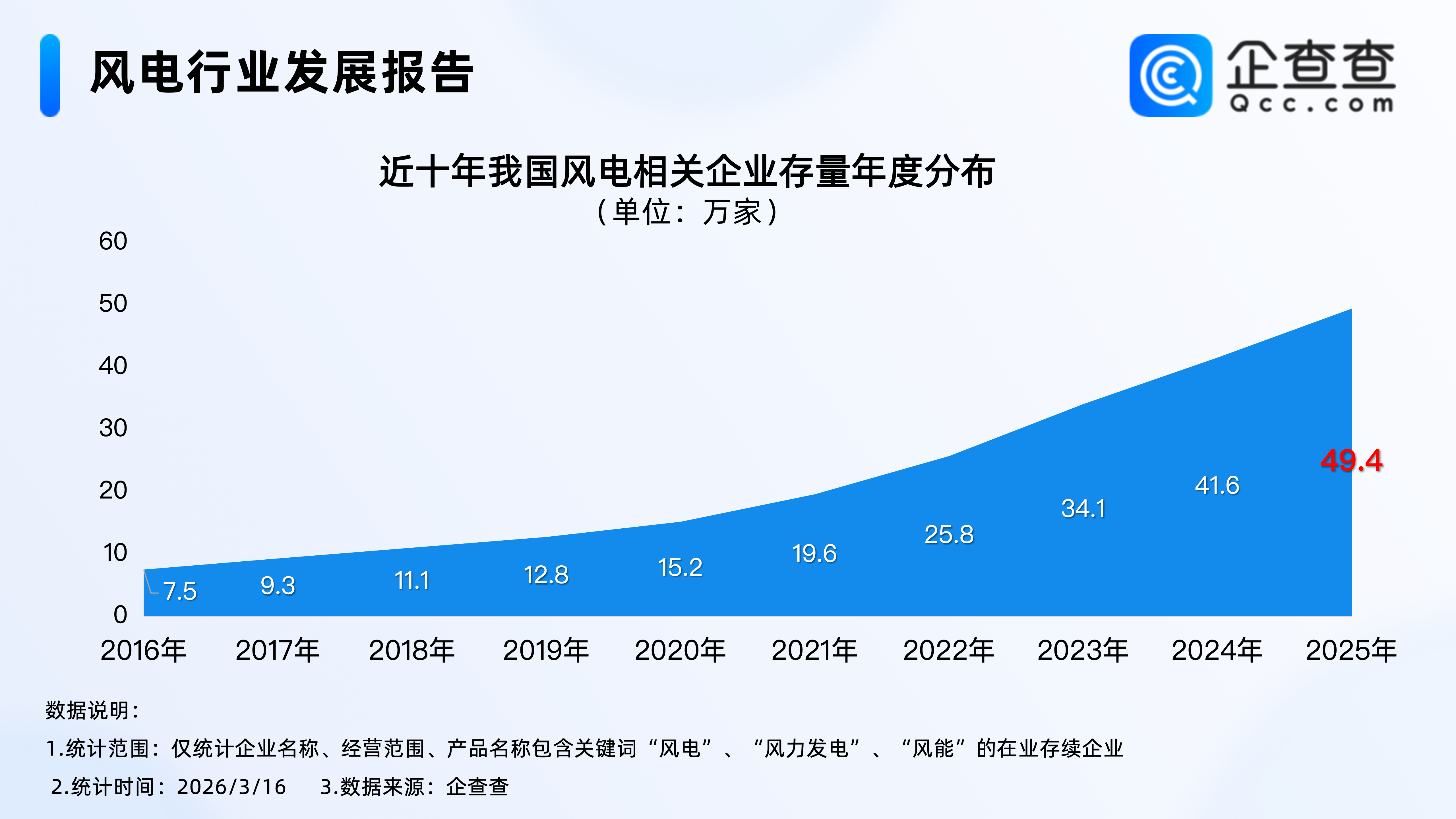 企查查数据显示,近十年,我国风电相关企业存量逐年增加,从2021年开始,增速加快,2025年年底,我国在业存续49.4万家风电相关企业。截至2026年3月16日,我国风电相关企业存量突破50万家,达50.7万家。