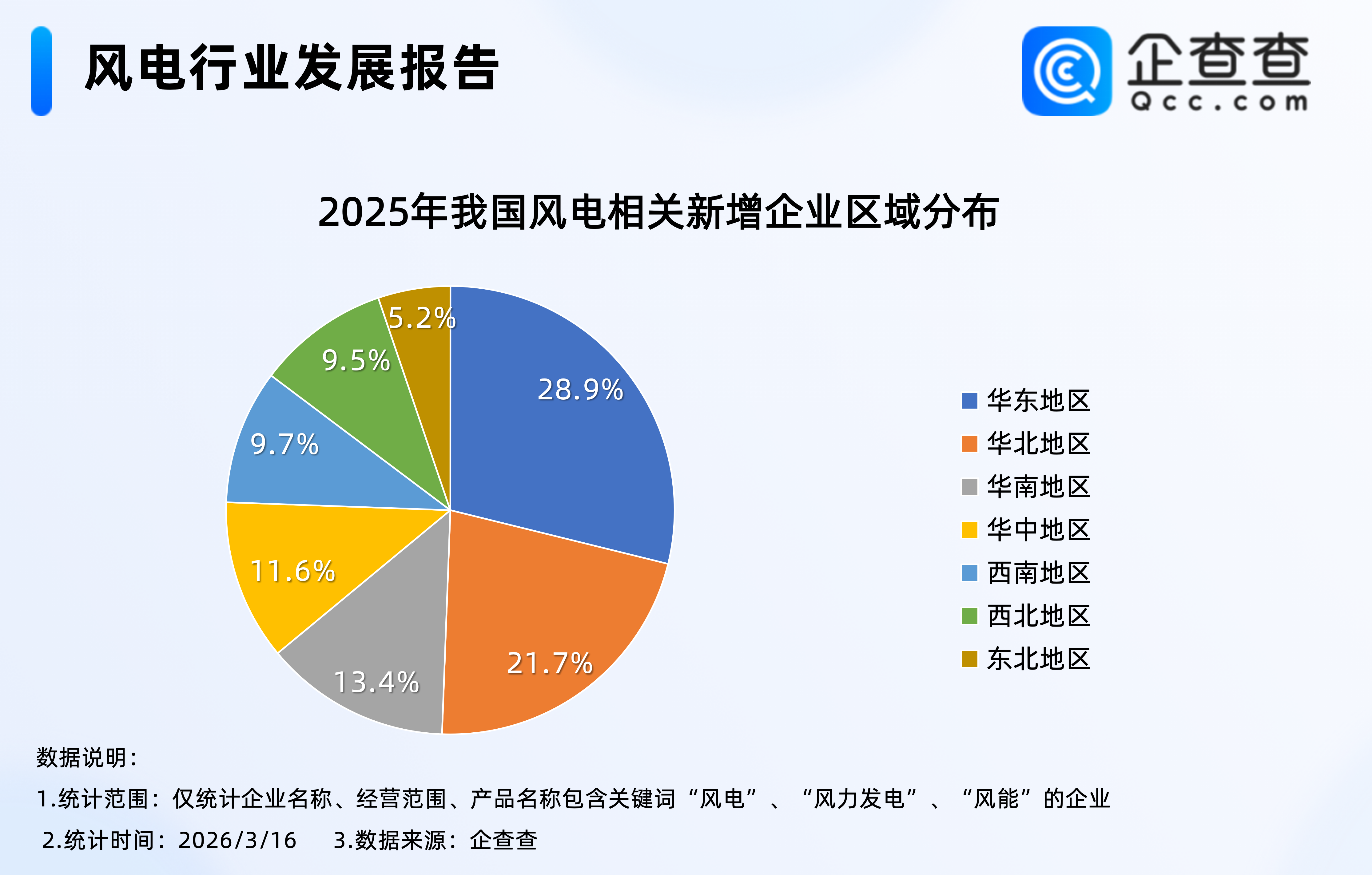 企查查数据显示,2025年注册的11.7万家风电相关企业中,分布在华东地区的相关企业最多,占比28.9%,其次是华北地区,占比21.7%,西北、东北地区相对较少,分别占比9.5%、5.2%。