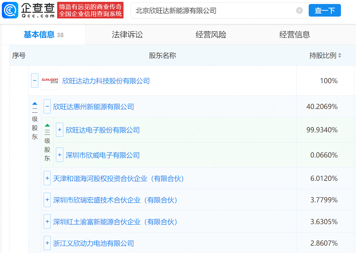 企查查APP显示,近日,北京欣旺达新能源有限公司成立,法定代表人为叶智林,注册资本3亿元,经营范围包含电池制造、电池销售、新兴能源技术研发、电动汽车充电基础设施运营等。企查查股权穿透显示,该公司由欣旺达(300207)旗下欣旺达动力科技股份有限公司全资持股。