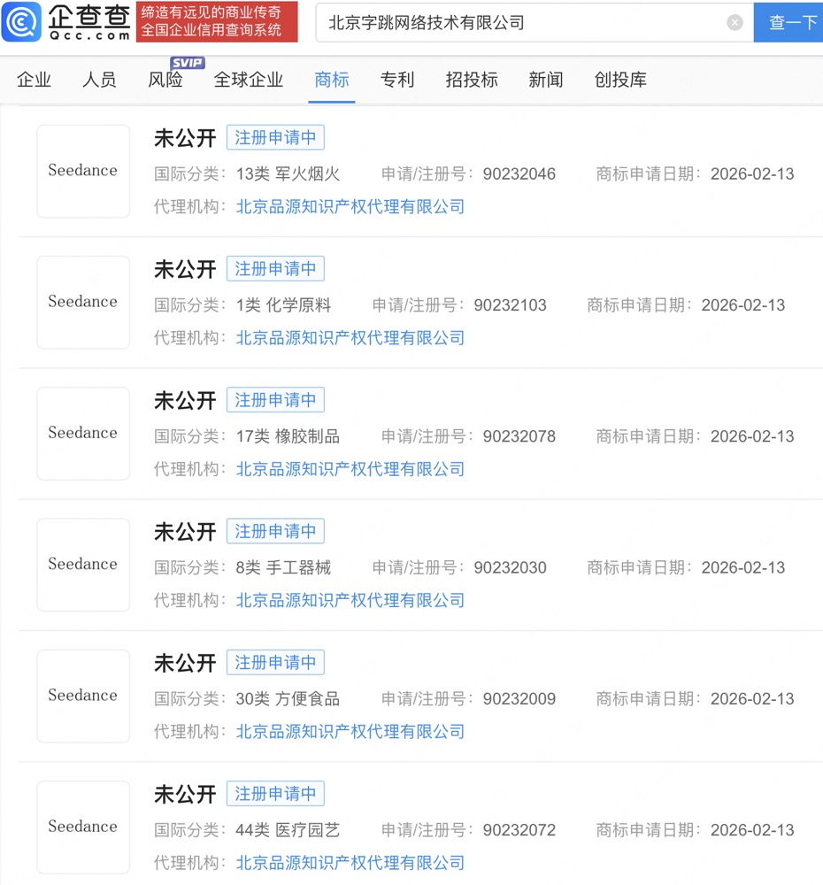 企查查APP显示,近日,北京字跳网络技术有限公司申请注册多枚“SEEDANCE”商标,国际分类包括方便食品、医疗园艺、化学原料等,当前商标状态均为注册申请中。
