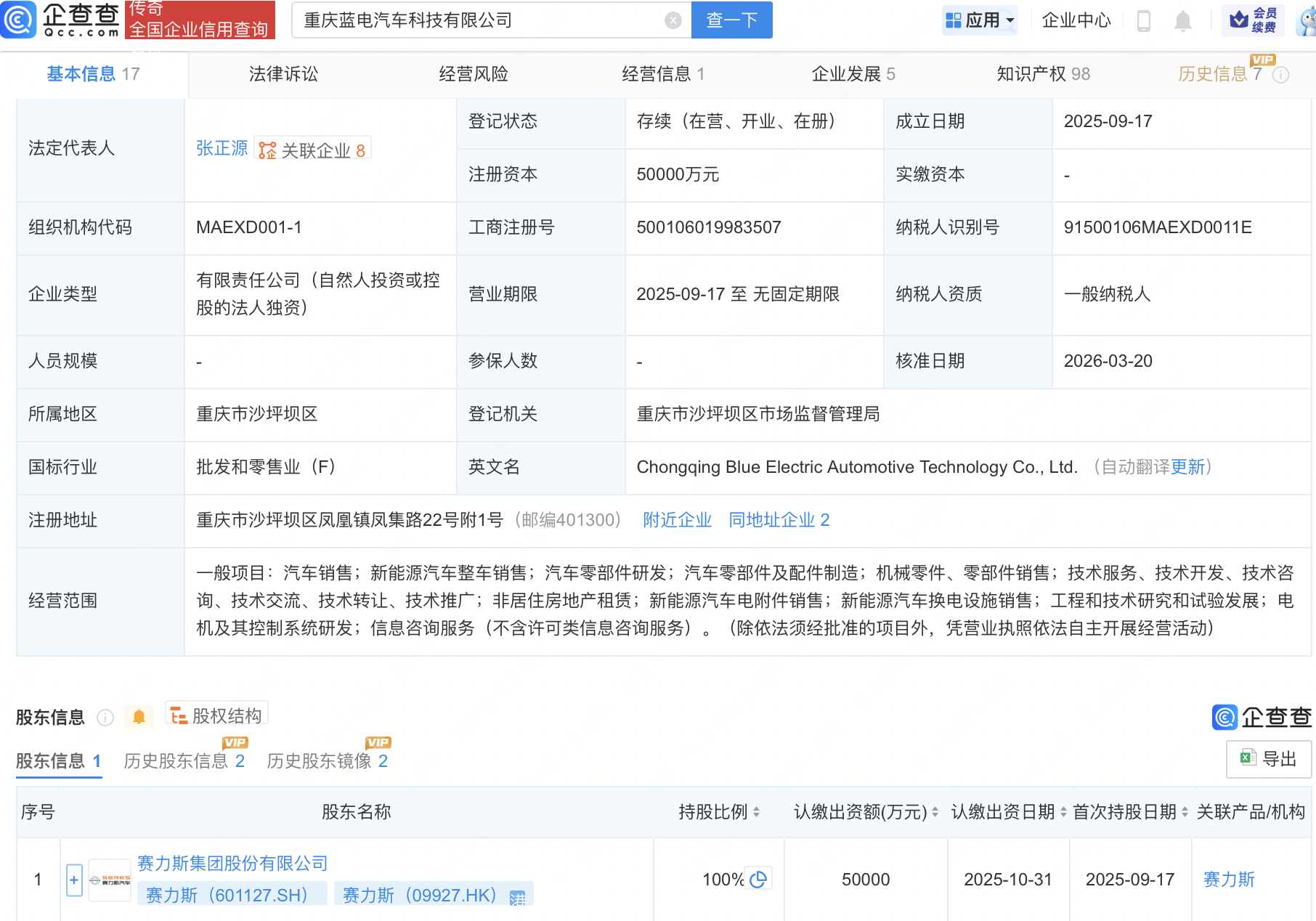 企查查APP显示,近日,重庆蓝电汽车科技有限公司发生工商变更,重庆青凤科技发展有限公司、重庆园投仓储服务有限公司退出股东行列,同时赛力斯(601127)持股比例由35%上升至100%。企查查信息显示,该公司成立于2025年9月,注册资本5亿元,经营范围包含:汽车销售;新能源汽车整车销售;汽车零部件研发;汽车零部件及配件制造等。