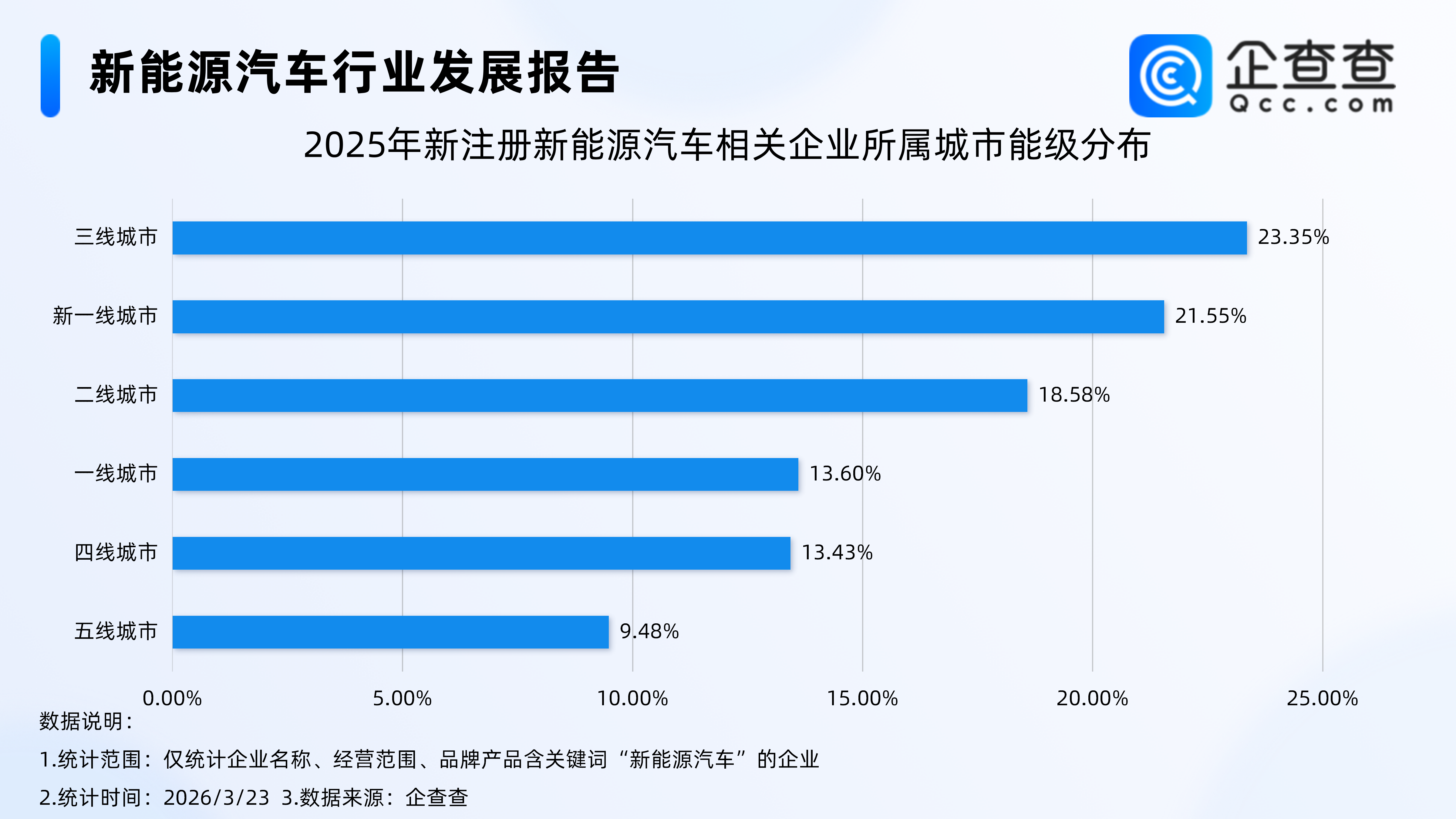 企查查数据显示,截至3月23日,国内新能源汽车相关现存企业达151.28万家。注册量方面,近十年相关企业注册量基本呈逐年上涨趋势,2021年、2022年、2023年注册量分别突破10万家,20万家、30万家。此后2024年、2025年注册量均在30万家以上,其中,2025年注册量达33.35万家,同比增长5.09%。从城市能级分布来看,2025年新注册企业主要分布在三线、新一线城市,分别占比23.35%、21.55%。
