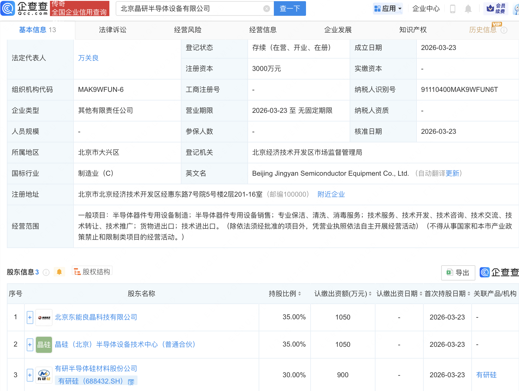 企查查APP显示,近日,北京晶研半导体设备有限公司成立,注册资本3000万元,经营范围包含:半导体器件专用设备制造;半导体器件专用设备销售;专业保洁、清洗、消毒服务等。企查查股权穿透显示,该公司由有研硅(688432)等共同持股。