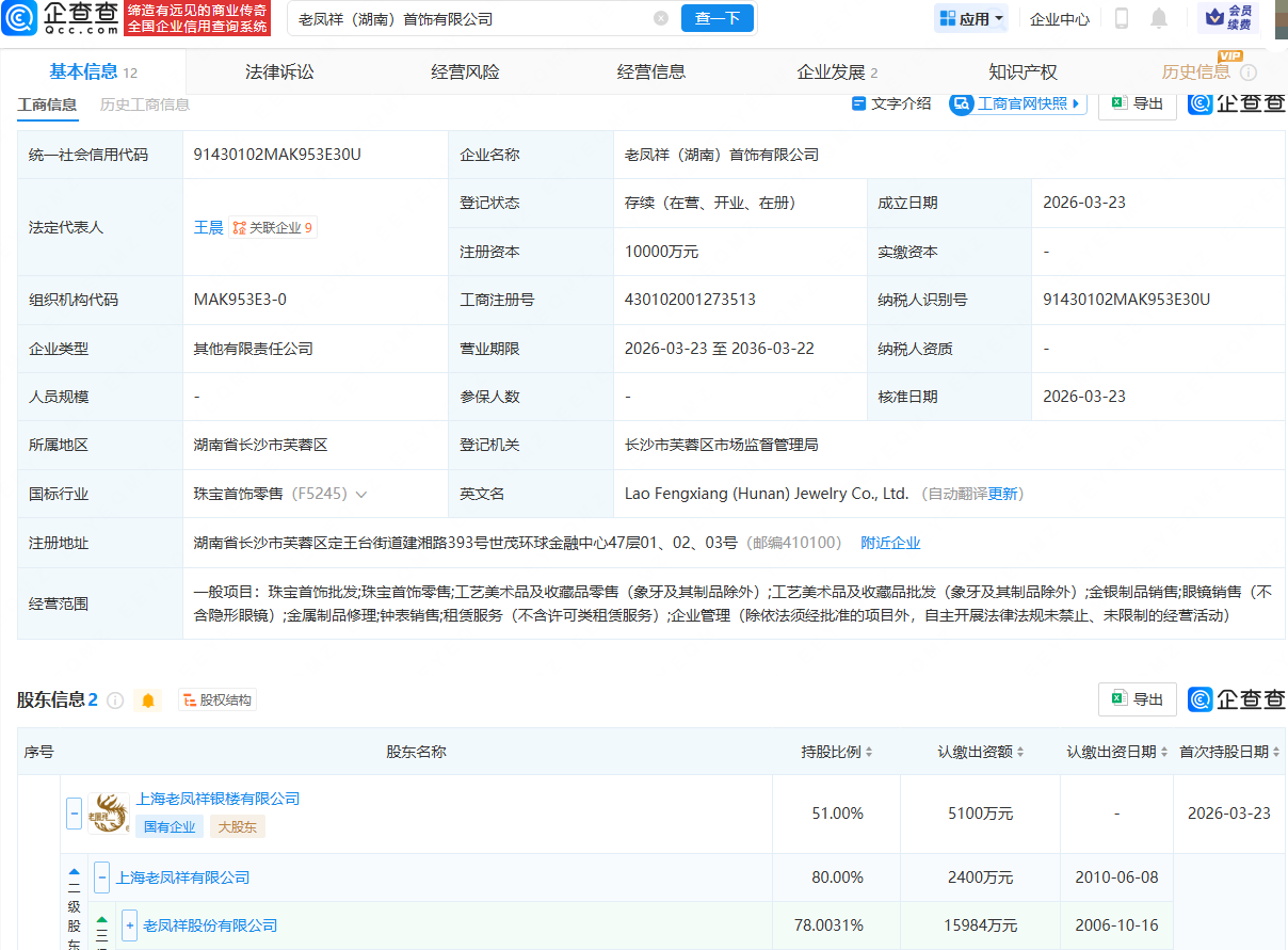 企查查APP显示,近日,老凤祥(湖南)首饰有限公司成立,法定代表人为王晨,注册资本1亿人民币,经营范围包括:珠宝首饰批发;珠宝首饰零售;工艺美术品及收藏品零售(象牙及其制品除外);金银制品销售等。企查查股权穿透显示,该公司由老凤祥(600612)旗下上海老凤祥银楼有限公司等共同持股。
