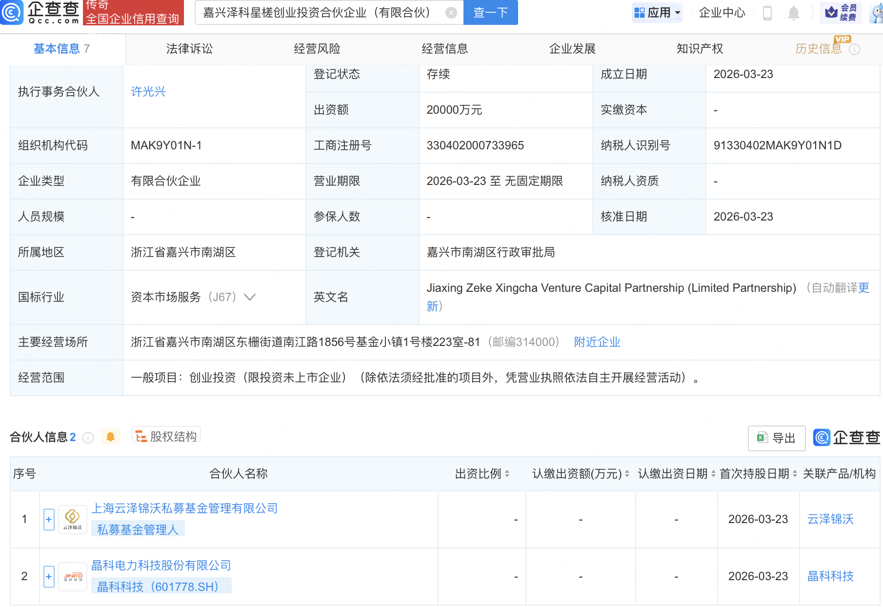 企查查APP显示,近日,嘉兴泽科星槎创业投资合伙企业(有限合伙)成立,出资额2亿元,经营范围包含:创业投资(限投资未上市企业)。企查查股权穿透显示,该企业由晶科科技(601778)等共同出资。