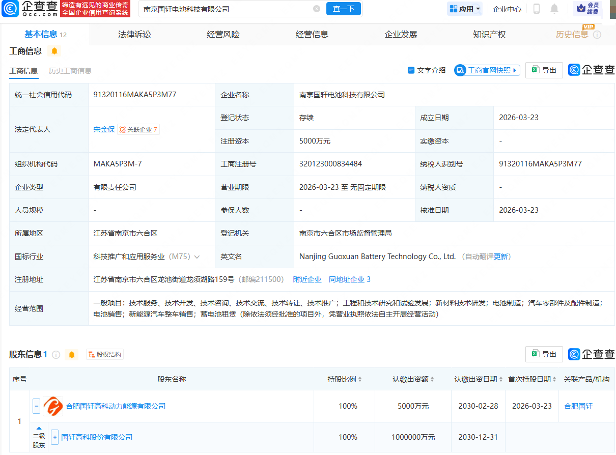 企查查APP显示,近日,南京国轩电池科技有限公司成立,法定代表人为宋金保,注册资本为5000万元,经营范围包含:新材料技术研发;电池制造;汽车零部件及配件制造;电池销售;新能源汽车整车销售;蓄电池租赁等。企查查股权穿透显示,该公司由国轩高科(002074)间接全资持股。