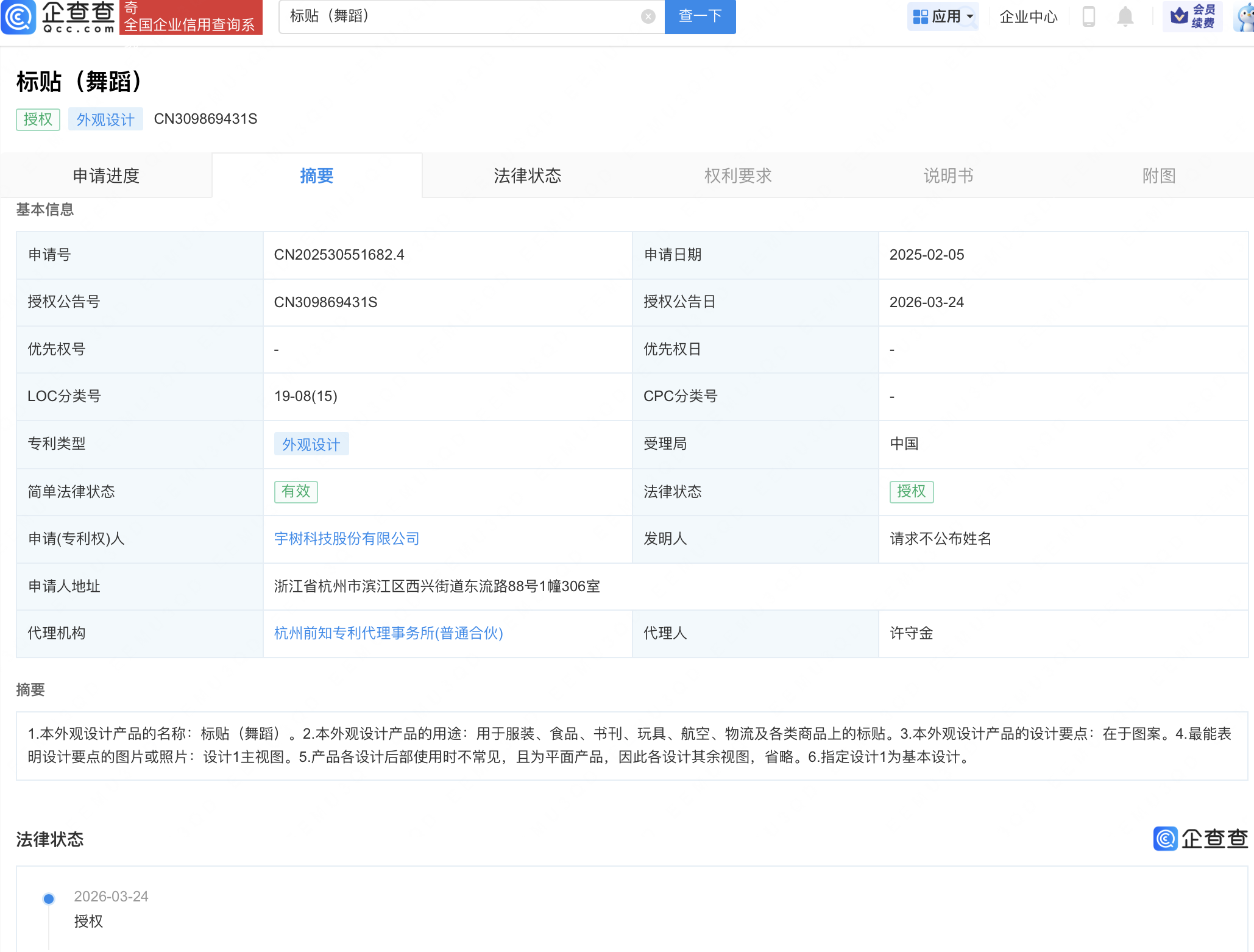 企查查APP显示,近日,宇树科技股份有限公司“标贴(舞蹈)”外观设计专利获授权。企查查专利摘要显示,本外观设计产品用于服装、食品、书刊、玩具、航空、物流及各类商品上,其设计要点在于图案。