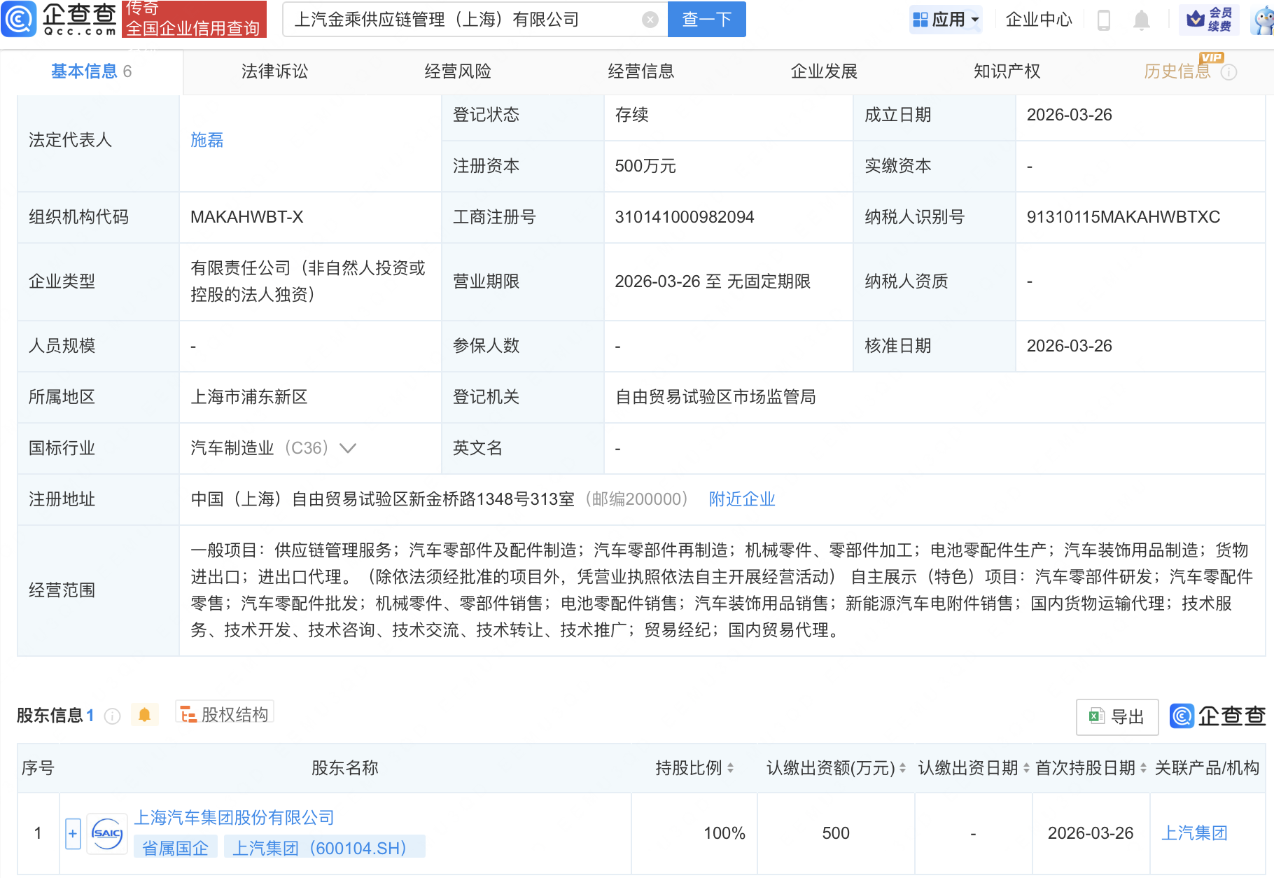 企查查APP显示,近日,上汽金乘供应链管理(上海)有限公司成立,经营范围包含:供应链管理服务;汽车零部件及配件制造;汽车零部件再制造;机械零件、零部件加工等。企查查股权穿透显示,该公司由上汽集团(600104)全资持股。