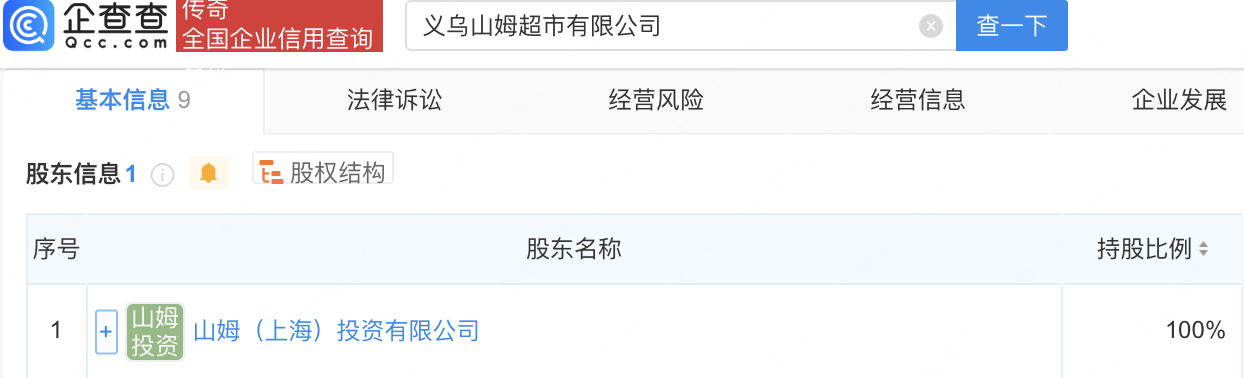 企查查APP显示,近日,义乌山姆超市有限公司成立,法定代表人为郑硕怀,注册资本300万美元,经营范围包括食品销售、食品经营管理、食品互联网销售、药品零售、第三类医疗器械经营、出版物零售等。企查查股权穿透显示,该公司由山姆(上海)投资有限公司全资持股。