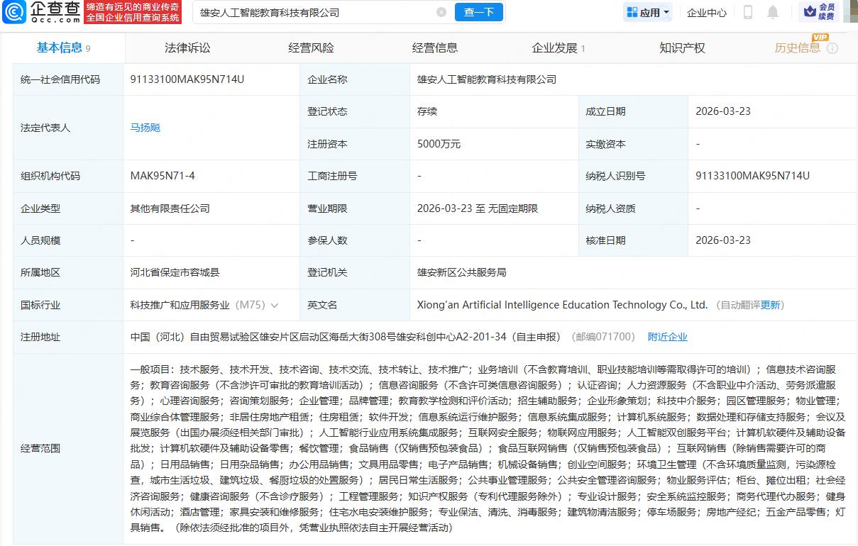 企查查APP显示,近日,雄安人工智能教育科技有限公司成立,法定代表人为马扬飚,注册资本为5000万元,经营范围包含:科技中介服务;园区管理服务;物业管理;商业综合体管理服务;非居住房地产租赁等。