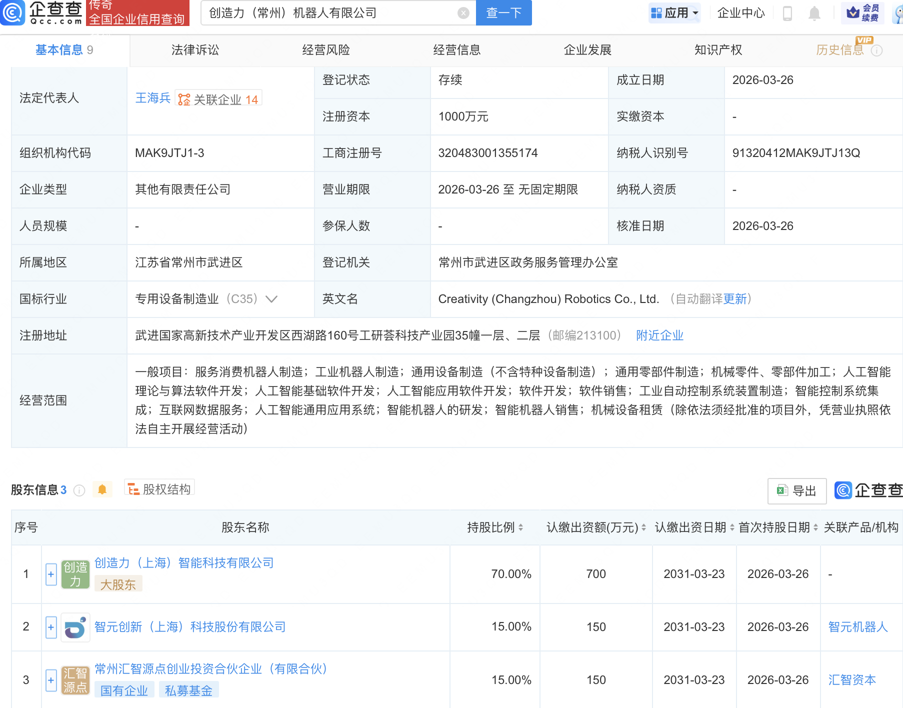 企查查APP显示,近日,创造力(常州)机器人有限公司成立,注册资本1000万元,经营范围包含:人工智能理论与算法软件开发;人工智能基础软件开发;人工智能应用软件开发;智能机器人的研发等。企查查股权穿透显示,该公司由智元机器人关联公司智元创新(上海)科技股份有限公司、常州汇智源点创业投资合伙企业(有限合伙)等共同持股。