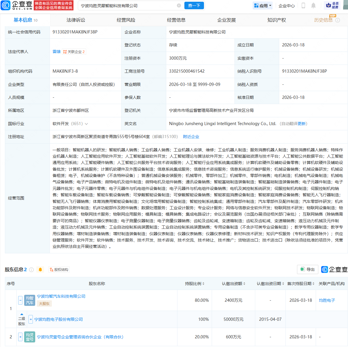 企查查APP显示,近日,宁波均胜灵犀智能科技有限公司成立,法定代表人为雷雄,注册资本为3000万元,经营范围包含:智能机器人的研发;智能机器人销售;工业机器人销售;工业机器人制造;人工智能基础软件开发等。企查查股权穿透显示,该公司由均胜电子(600699)全资子公司宁波均智汽车科技有限公司、宁波均灵壹号企业管理咨询合伙企业(有限合伙)共同持股。