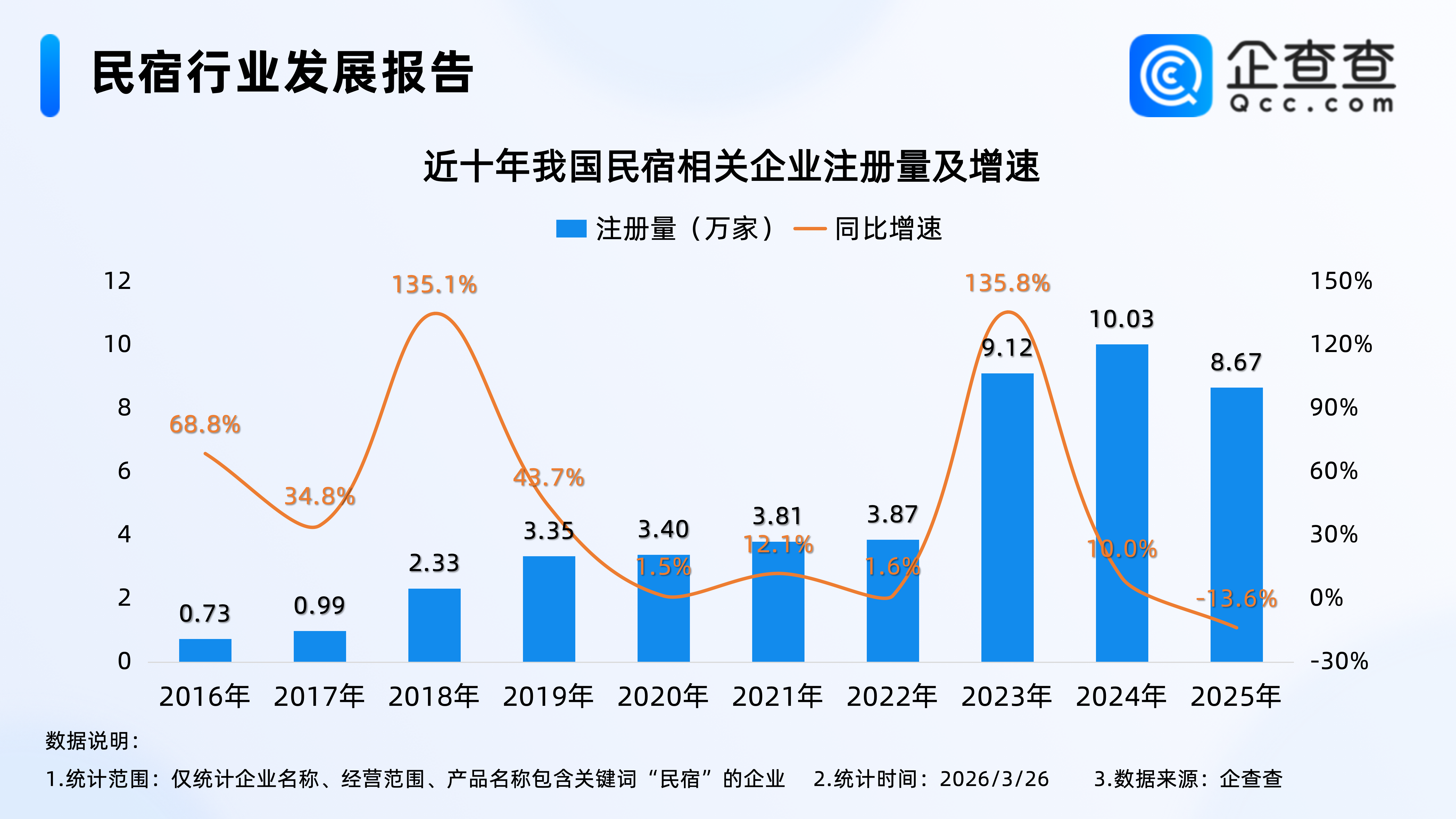 企查查数据显示,2023年我国民宿相关企业注册量同比大幅增加135.8%至9.12万家,达近十年注册量增速峰值,此后年度每年注册量均保持在8万家以上。截至3月26日,2026年我国已注册1.6万家民宿相关企业。