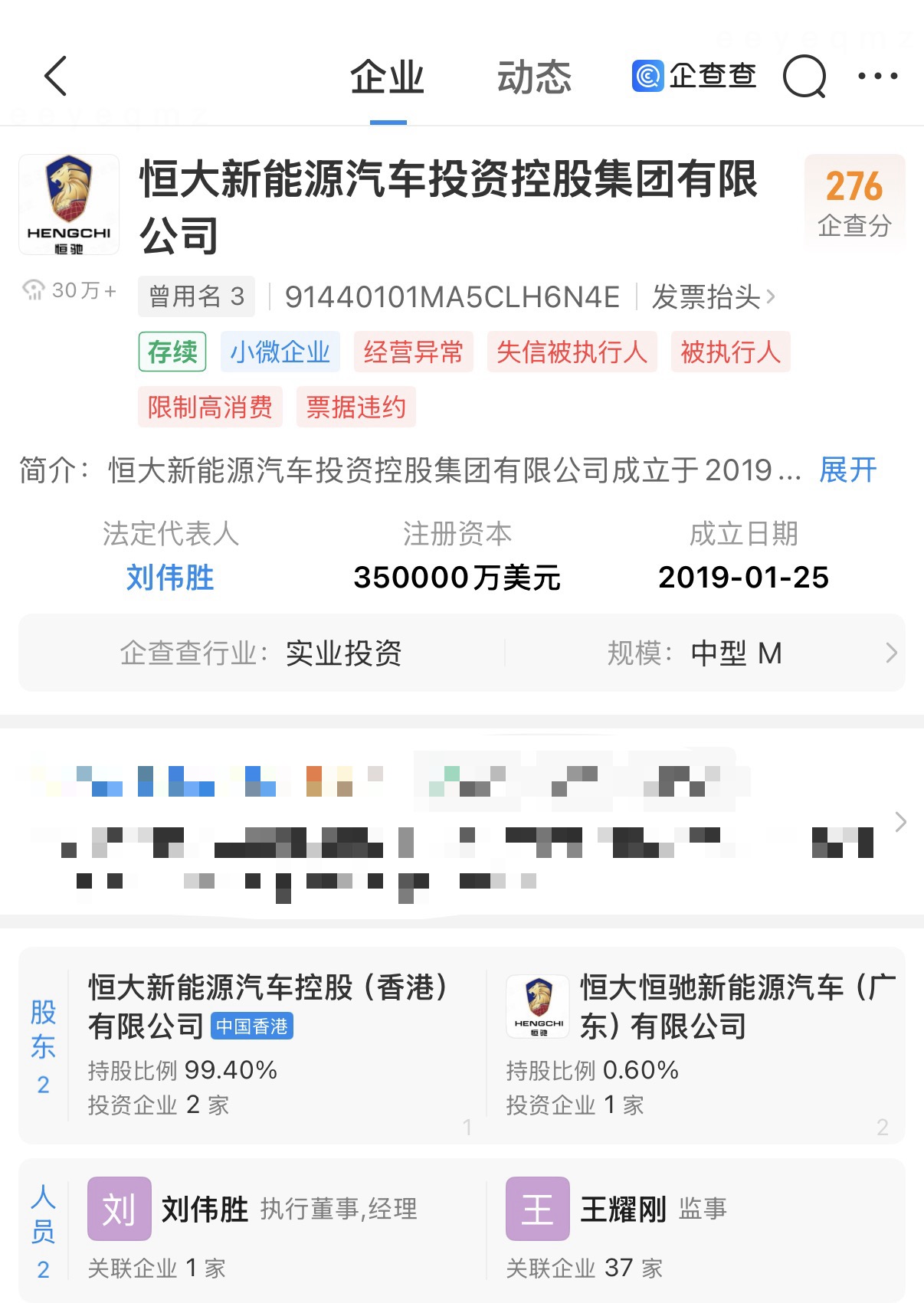 企查查显示,恒大新能源汽车投资控股集团有限公司成立于2019年1月,法定代表人为刘伟胜,注册资本35亿美元,由恒大新能源汽车控股(香港)有限公司、恒大恒驰新能源汽车(广东)有限公司共同持股。