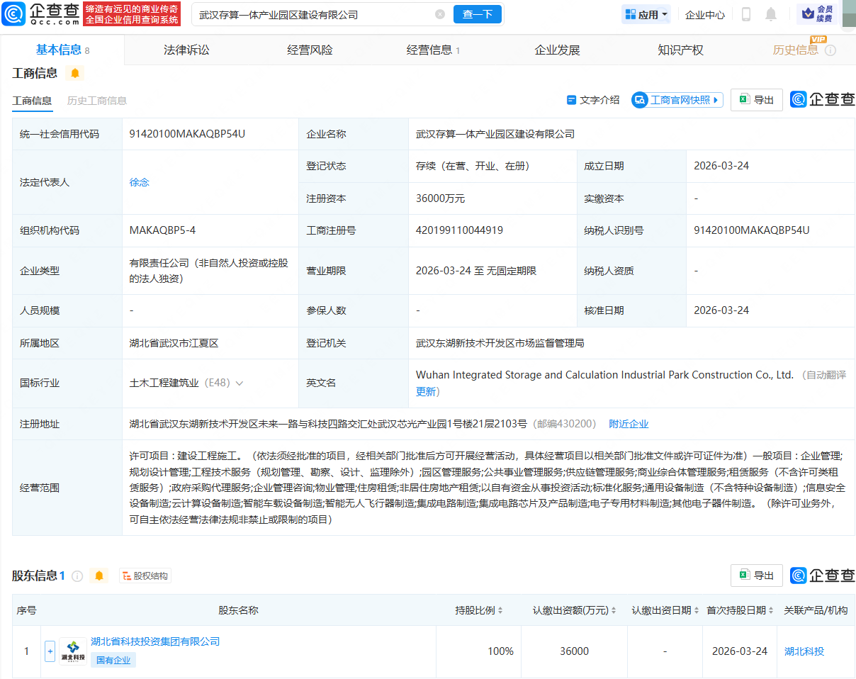 企查查APP显示,近日,武汉存算一体产业园区建设有限公司成立,法定代表人为徐念,注册资本为3.6亿元,经营范围包含:供应链管理服务;商业综合体管理服务;云计算设备制造;智能车载设备制造;智能无人飞行器制造等。企查查股权穿透显示,该公司由湖北省科技投资集团有限公司全资持股。