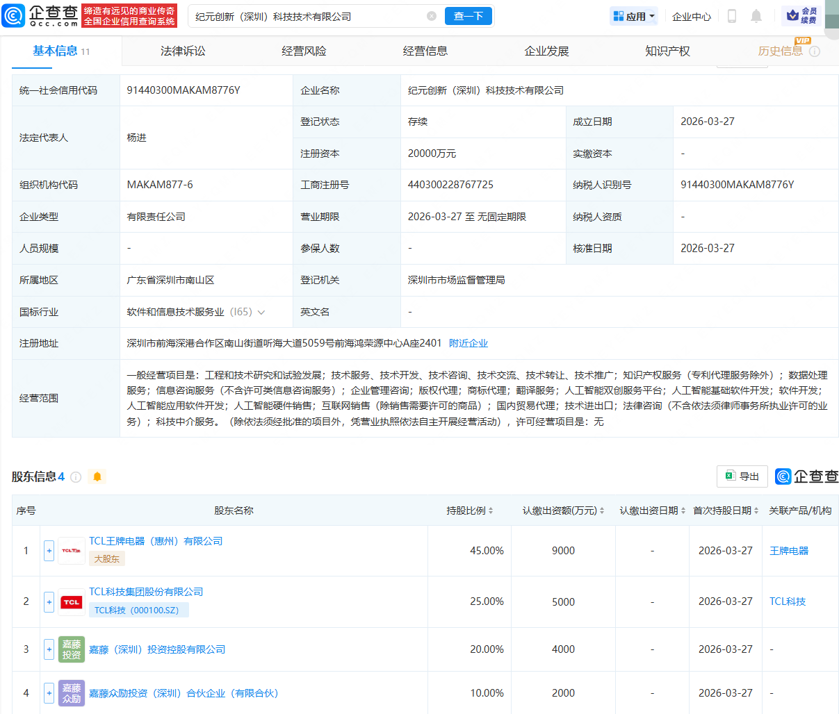 企查查APP显示,近日,纪元创新(深圳)科技技术有限公司成立,法定代表人为杨进,注册资本为2亿元,经营范围包含:人工智能双创服务平台;人工智能基础软件开发;软件开发;人工智能应用软件开发等。企查查股权穿透显示,该公司由TCL王牌电器(惠州)有限公司、TCL科技(000100)等共同持股。