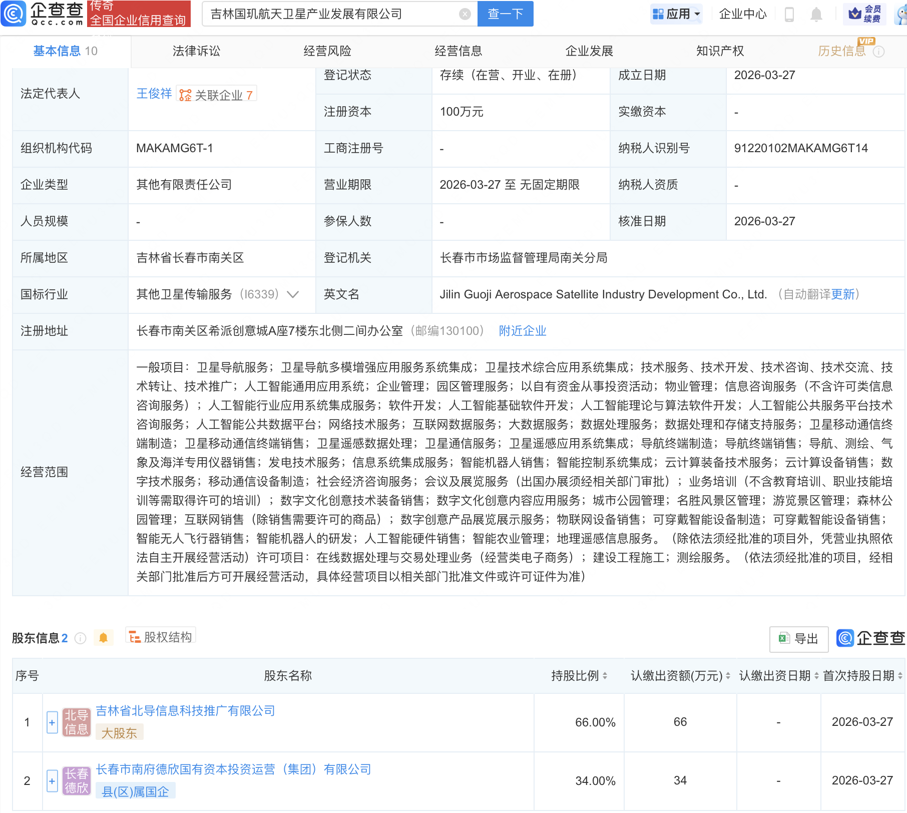企查查APP显示,近日,吉林国玑航天卫星产业发展有限公司成立,经营范围包含:卫星移动通信终端制造;卫星移动通信终端销售;卫星遥感数据处理;卫星通信服务等。企查查股权穿透显示,该公司由吉林省北导信息科技推广有限公司、长春市南府德欣国有资本投资运营(集团)有限公司共同持股。