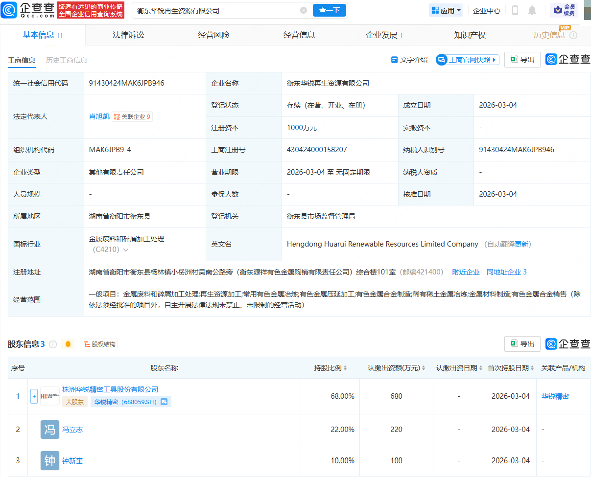 企查查APP显示,近日,衡东华锐再生资源有限公司成立,法定代表人为肖旭凯,注册资本为1000万元,经营范围包含:金属废料和碎屑加工处理;再生资源加工;常用有色金属冶炼;稀有稀土金属冶炼;金属材料制造等。企查查股权穿透显示,该公司由华锐精密(688059)等共同持股。