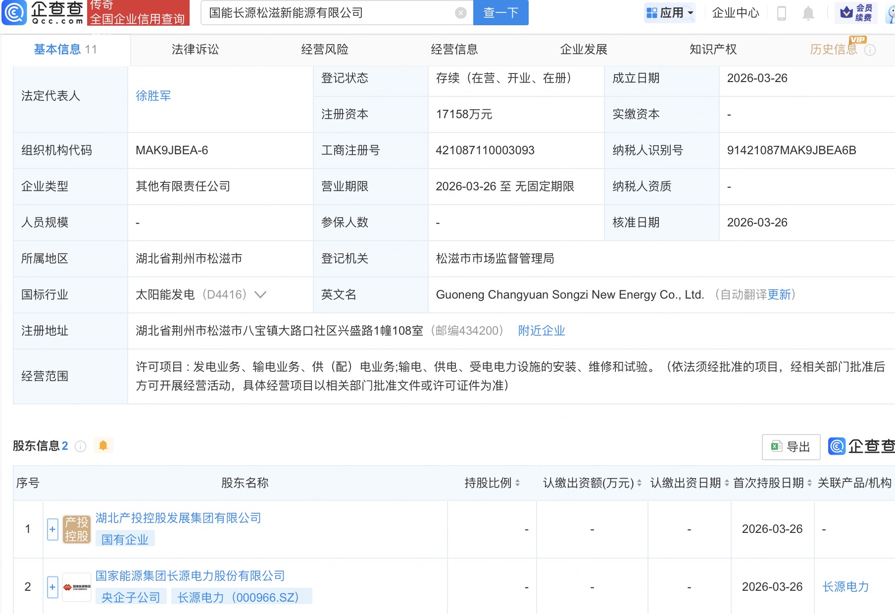 企查查APP显示,近日,国能长源松滋新能源有限公司成立,经营范围包含:发电业务、输电业务、供(配)电业务;输电、供电、受电电力设施的安装、维修和试验。企查查股权穿透显示,该公司由长源电力(000966)、湖北产投控股发展集团有限公司共同持股。