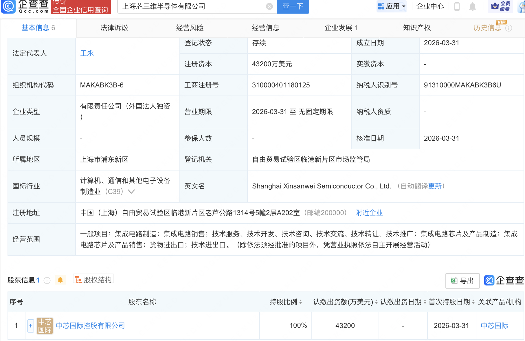 企查查APP显示,近日,上海芯三维半导体有限公司成立,法定代表人为王永,注册资本4.32亿美元,经营范围包括集成电路制造、集成电路销售、集成电路芯片及产品制造、集成电路芯片及产品销售等。企查查股权穿透显示,该公司由中芯国际控股有限公司全资持股。