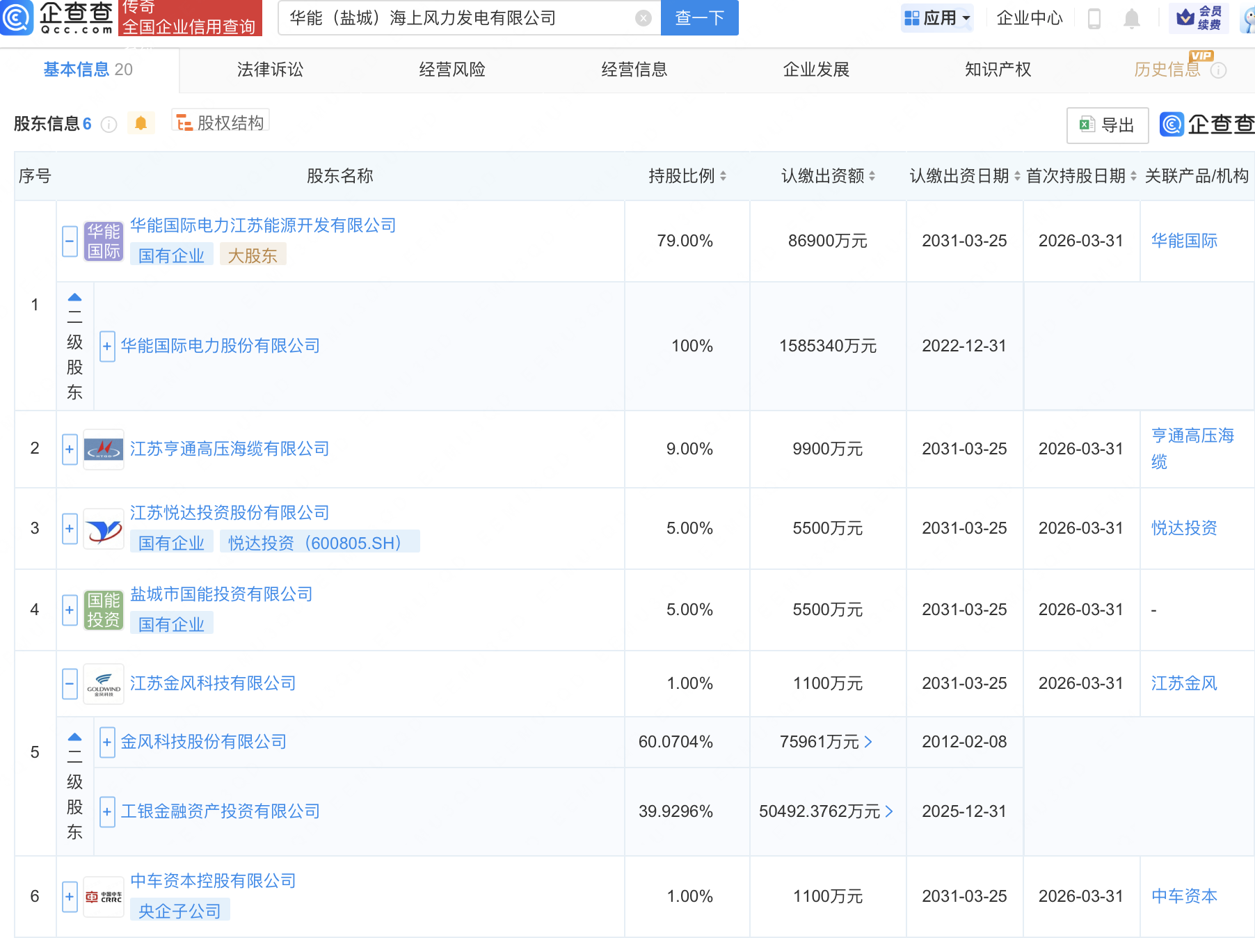 企查查APP显示,近日,华能(盐城)海上风力发电有限公司成立,注册资本11亿元,经营范围包含:太阳能热利用产品销售;储能技术服务;太阳能发电技术服务;新材料技术研发等。企查查股权穿透显示,该公司由华能国际(600011)全资子公司华能国际电力江苏能源开发有限公司、悦达投资(600805)等共同持股。