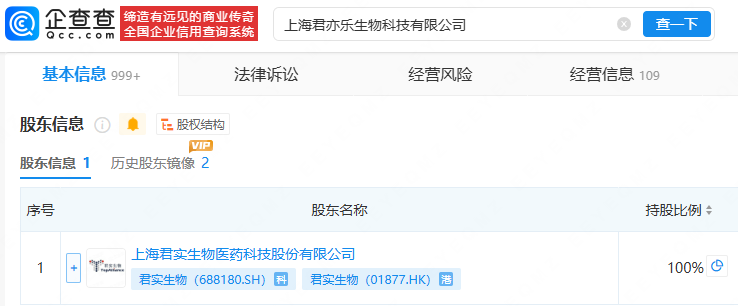 企查查APP显示,近日,上海君亦乐生物科技有限公司发生工商变更,注册资本从5亿元增加到24亿元,增加19亿元。企查查显示,该公司成立于2026年1月,法定代表人为谢皖,由君实生物(688180)全资持股。