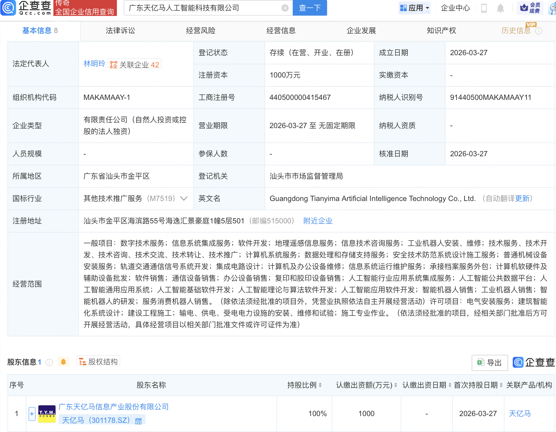 企查查APP显示,近日,广东天亿马人工智能科技有限公司成立,注册资本1000万元,经营范围包含:人工智能行业应用系统集成服务;人工智能公共数据平台;人工智能通用应用系统;人工智能基础软件开发等。企查查股权穿透显示,该公司由天亿马(301178)全资持股。