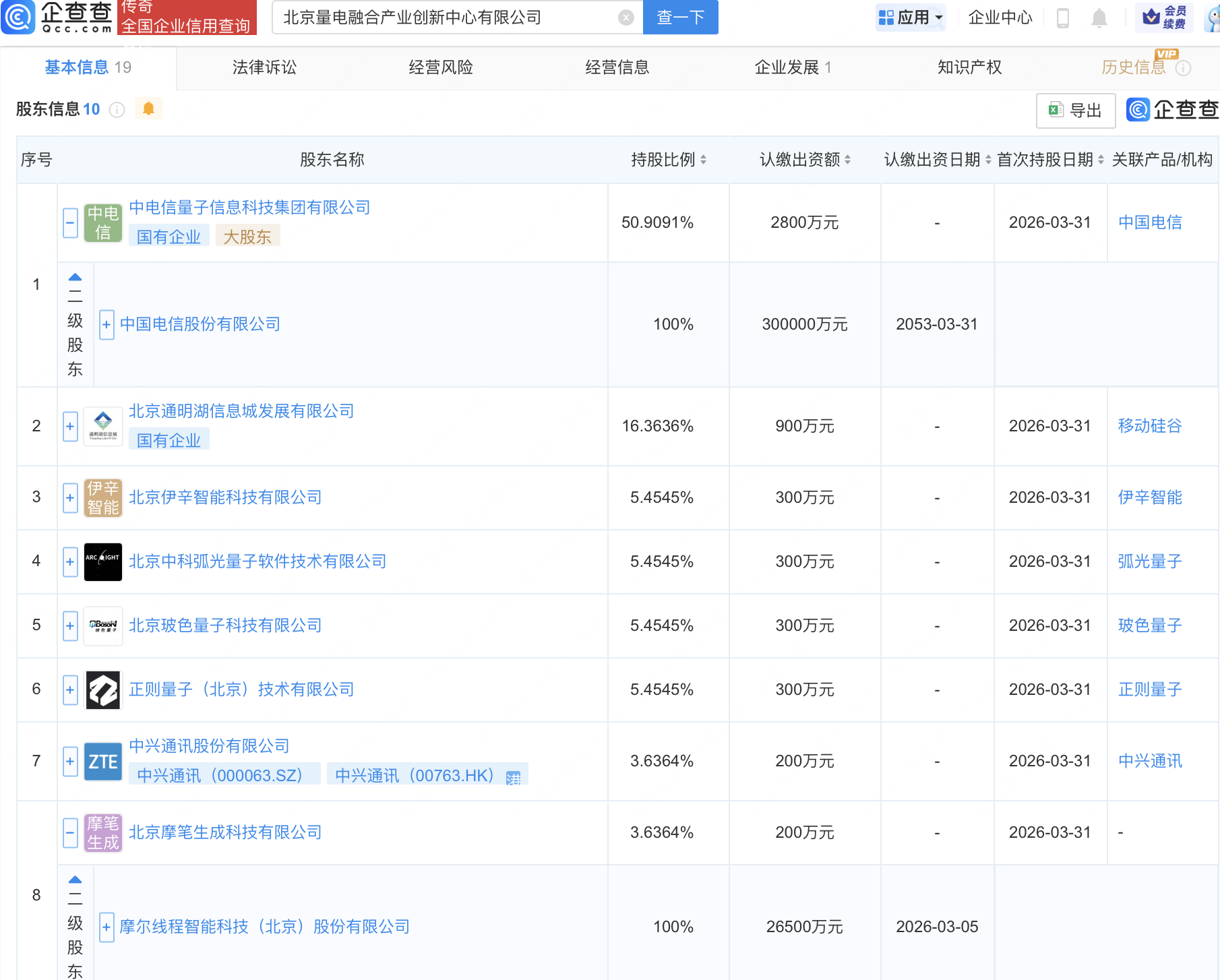 企查查APP显示,近日,北京量电融合产业创新中心有限公司成立,注册资本5500万元,经营范围包含:量子计算技术服务;人工智能应用软件开发;网络与信息安全软件开发等。企查查股权穿透显示,该公司由中国电信(601728)全资子公司中电信量子信息科技集团有限公司、中兴通讯(000063)、摩尔线程(688795)全资子公司北京摩笔生成科技有限公司等共同持股。
