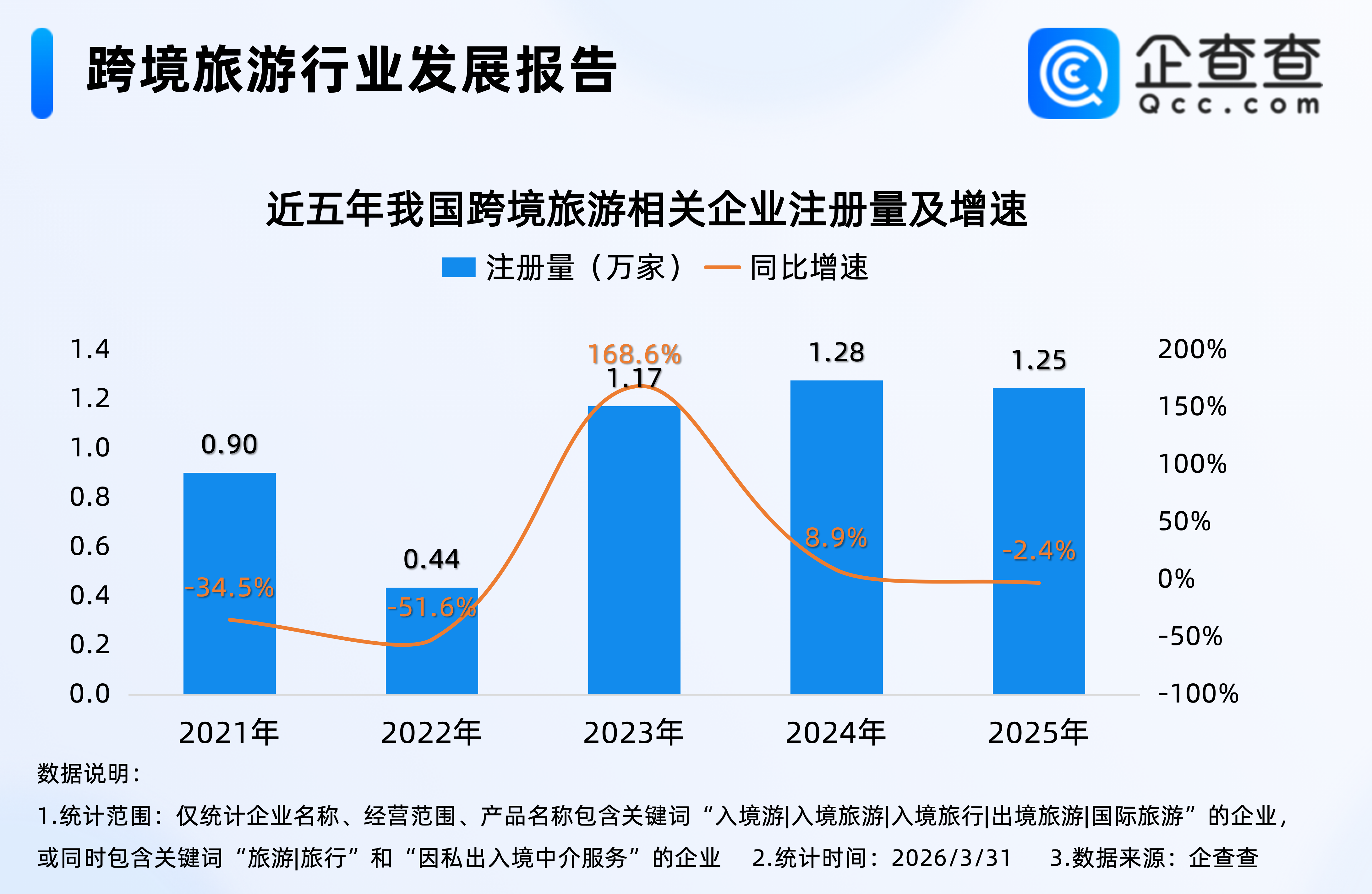 企查查数据显示,2021年以来,我国跨境旅游相关企业注册量逐渐稳定在1万家以上,2025年全年,我国注册1.25万家跨境旅游相关企业。截至3月31日,2026年我国已注册2067家跨境旅游相关企业。