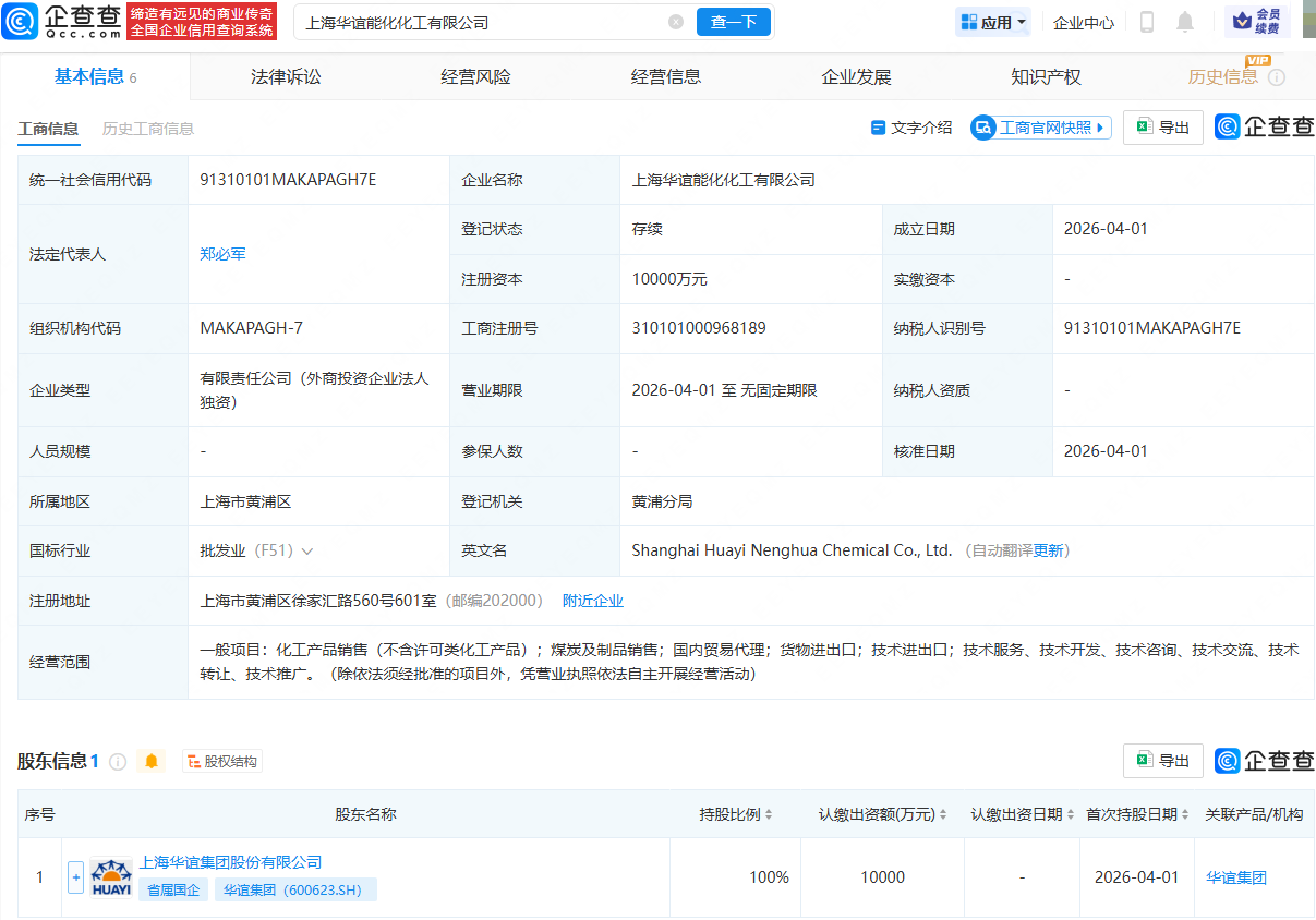企查查APP显示,近日,上海华谊能化化工有限公司成立,法定代表人为郑必军,注册资本为1亿元,经营范围包含:化工产品销售(不含许可类化工产品);煤炭及制品销售;国内贸易代理;货物进出口等。企查查股权穿透显示,该公司由华谊集团(600623)全资持股。