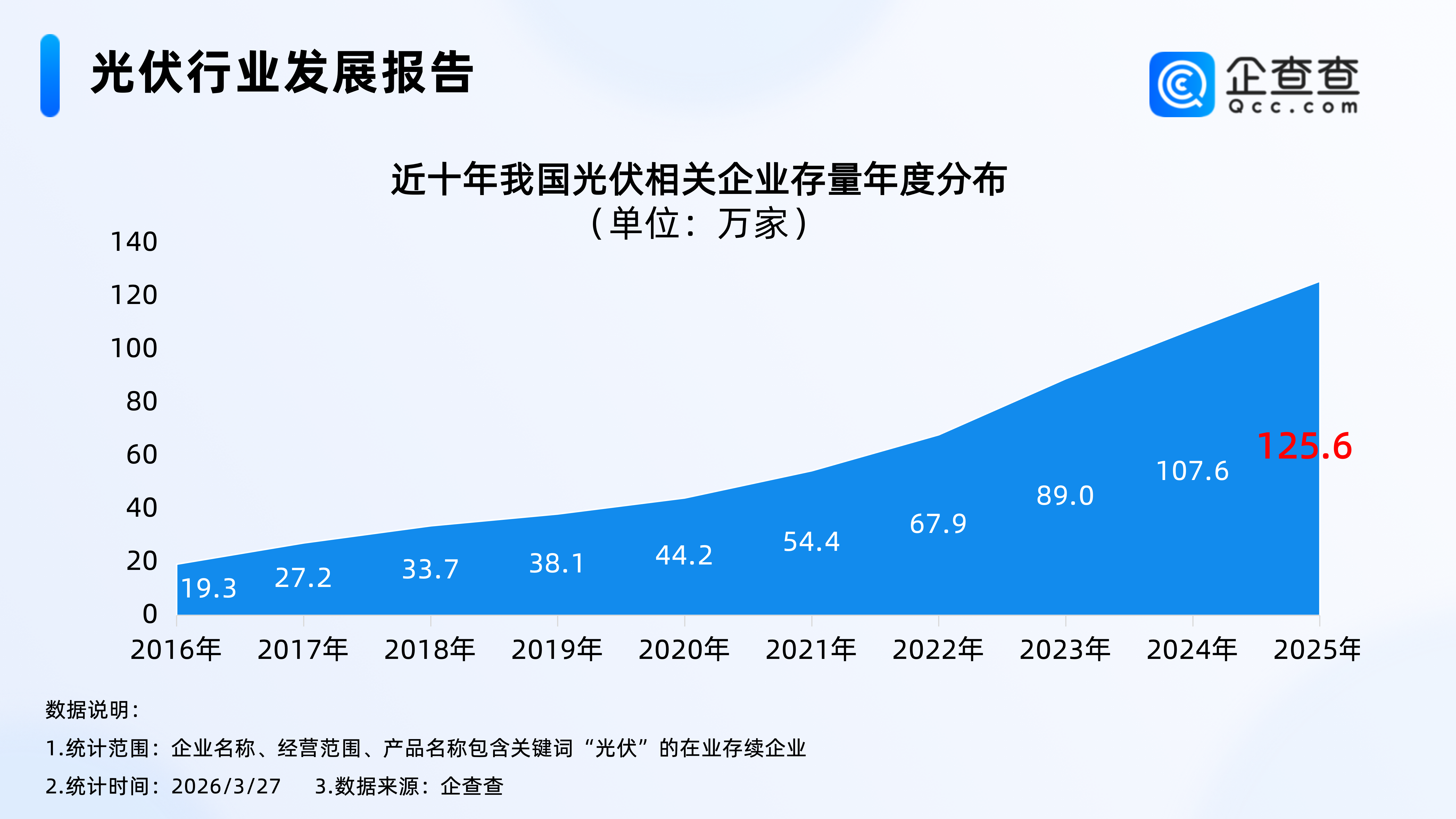 企查查数据显示,2016年以来,我国光伏相关企业存量逐年增加,2022年开始,光伏相关企业存量增速加快,于2024年首次突破100万家,截至2026年3月27日,我国现存129.1万家光伏相关企业。